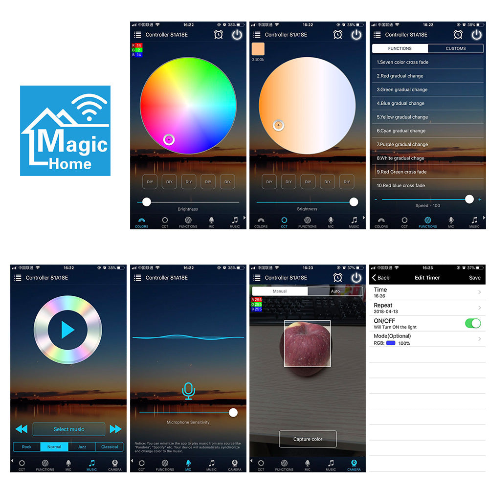 Up to 16 million kinds of static colors and 20 kinds dynamic modes can be set on APP; Support voice / music control function on APP; Use the phone camera can pick up light color; Use the smartphone / IR remote controller can adjust the brightness and speed; One phone can control multiple Wi-Fi controllers (depend on router setting).