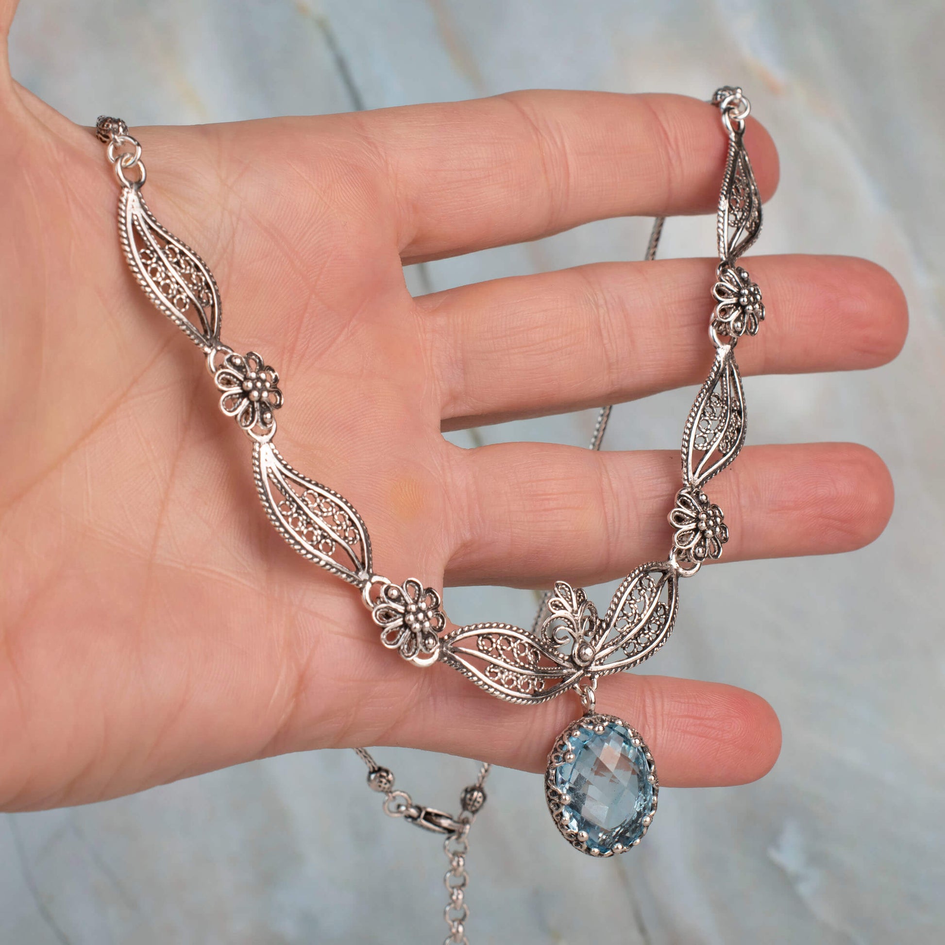 Sterling Silver Filigree Art Blue Topaz Gemstone Paisley Design Necklace