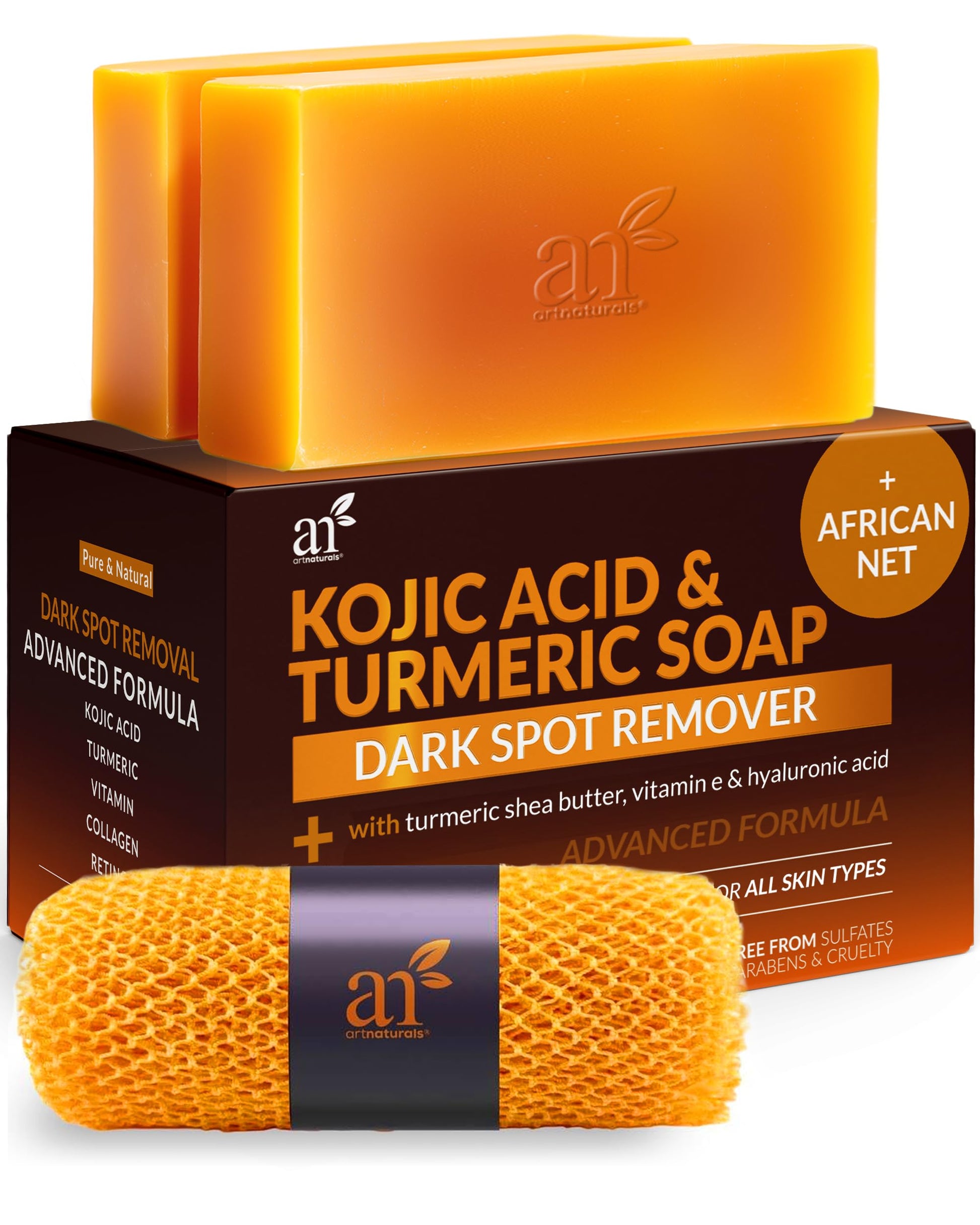 Artnaturals Kojic Acid Soap + African Net Sponge (2 pack X 142g Turmeric bars) Dark spot remover & Scars - Original Japanese Complex Vitamin C, Hyaluronic Acid, retinol, shea butter (Citrus)