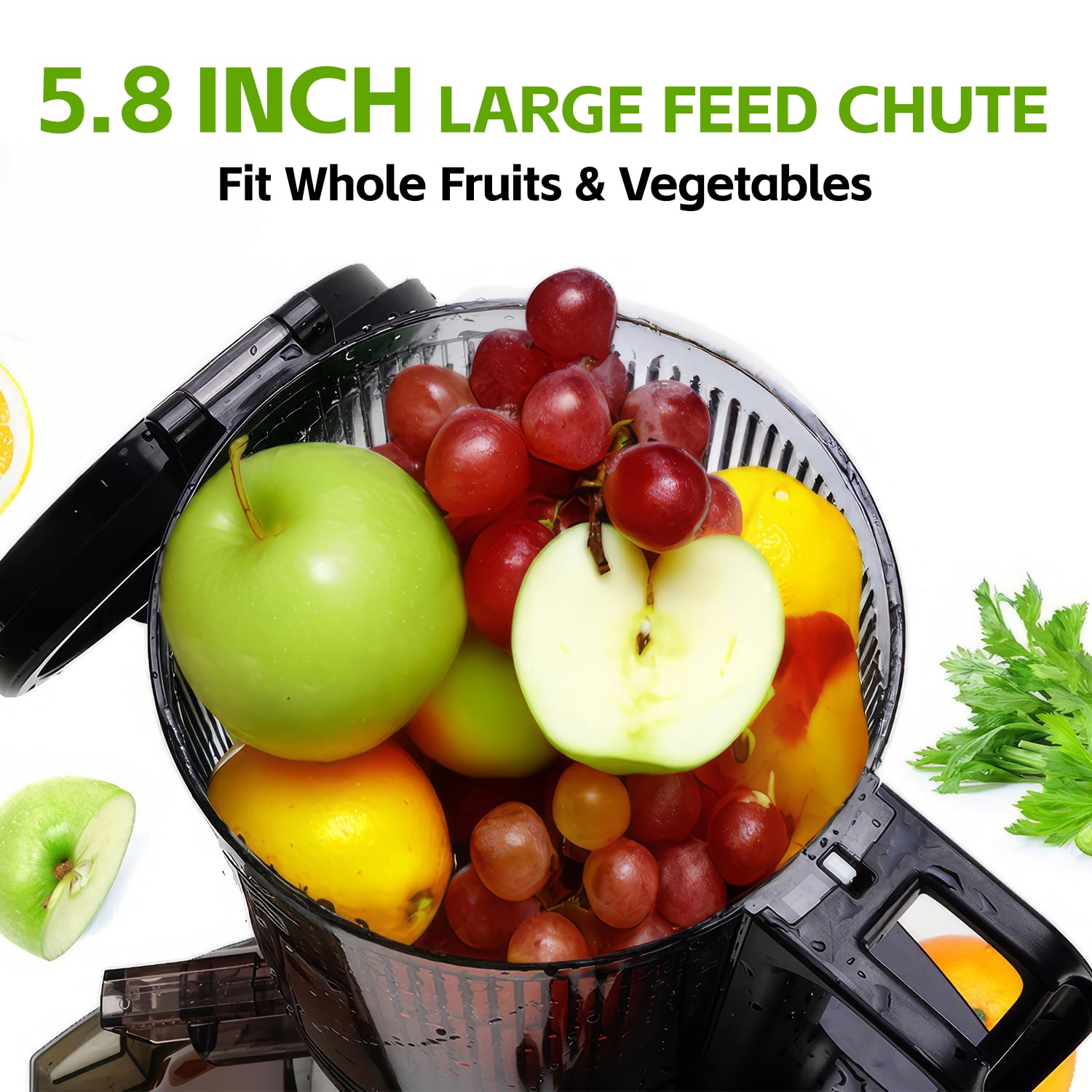- 【5.8inch Feed Chute】The juicer is equipped with a large 5.8-inch feed chute that you can juice whole fruits and vegetables without chopping.This powerful juicer is also more friendly and safer for children.