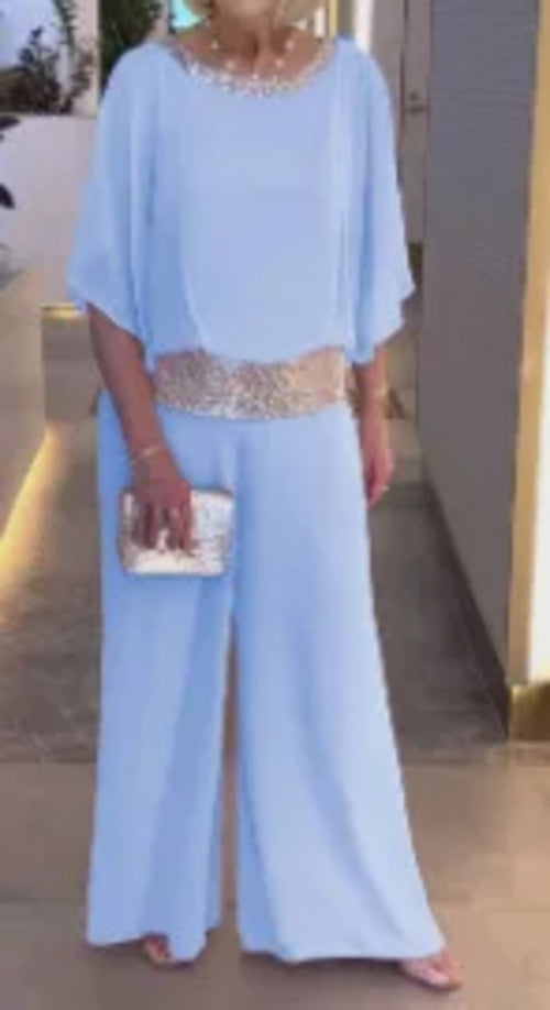 Fashion Sequin Splicing Chiffon Shirt Women's Bat Short Sleeved Suit