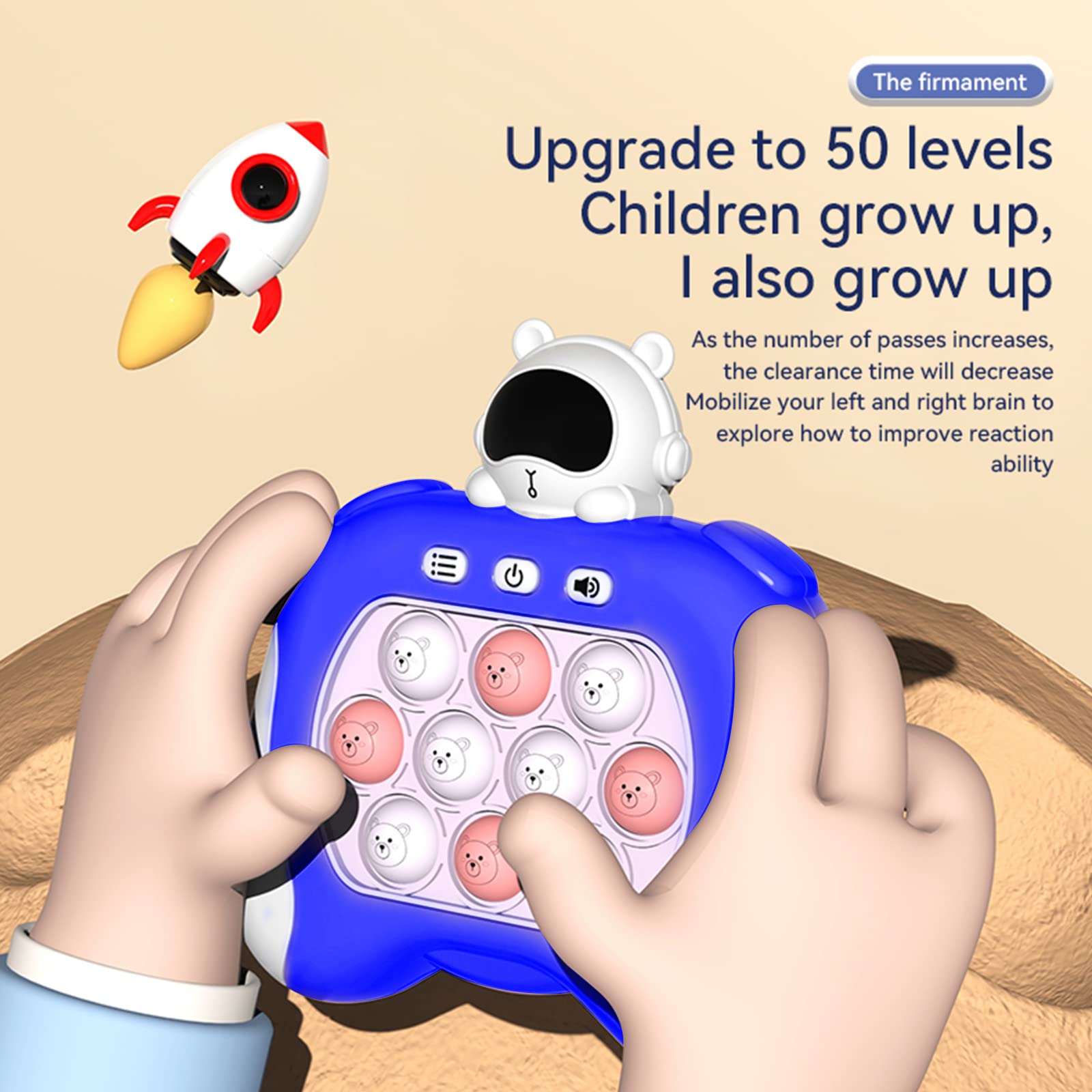 - 【Excellent Design】Fast push game console is made of high-quality silicone material, the bubbles are not easy to burst. Ergonomically designed even long holding and playing will not feel sore hands. The portable size makes it easy to enjoy the game anytime and anywhere. Adjustable volume can be muted.(Requires 3*AAA batteries, not included)