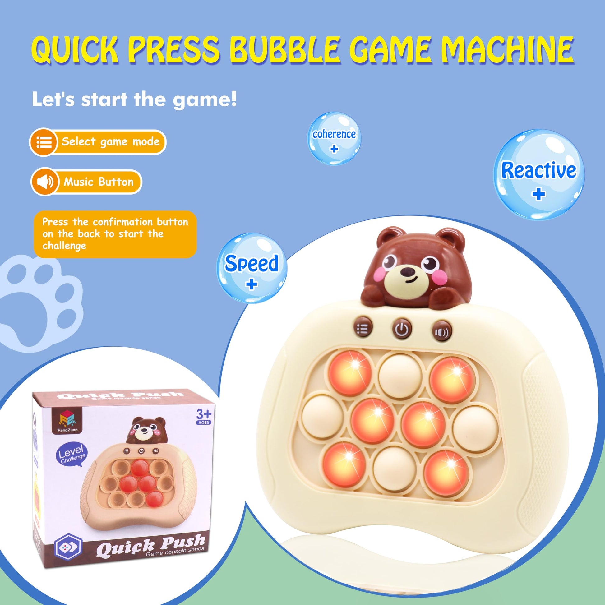 - 【4 Game Challenge Modes】 Breakthrough Mode and Memory Mode - Remember randomly light up bubble and fast push bubble and correctly to pass each level, if you press wrong it will be game over. Scoring mode and multiplayer mode - Support Timed Challenge/level PK. Each mode has different difficulty levels, helps to exercise children's reaction speed and memory, competition and cooperation.