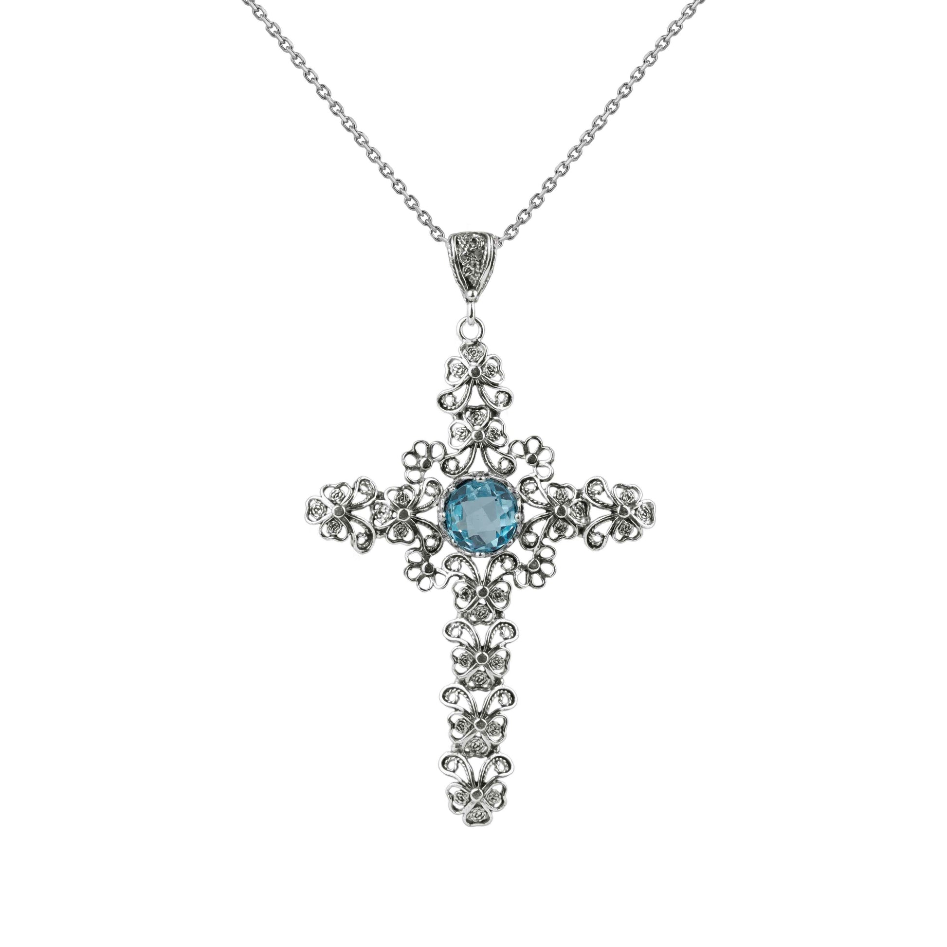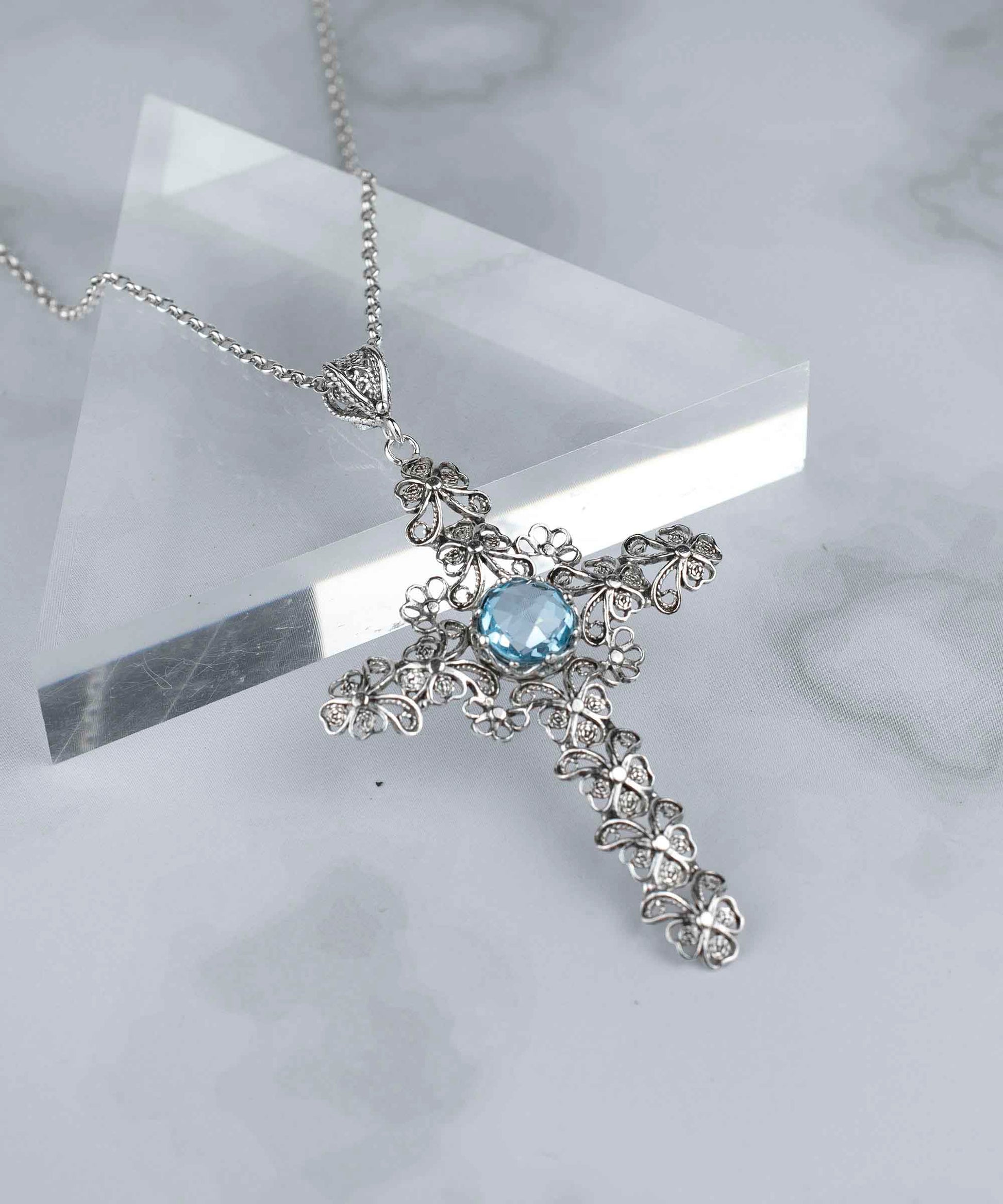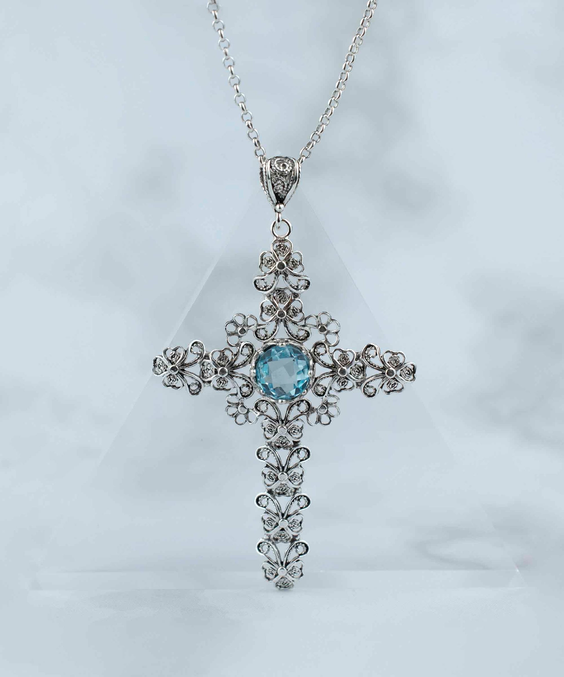 Filigree Art Blue Topaz Gemstone Silver Cross Design Women Pendant