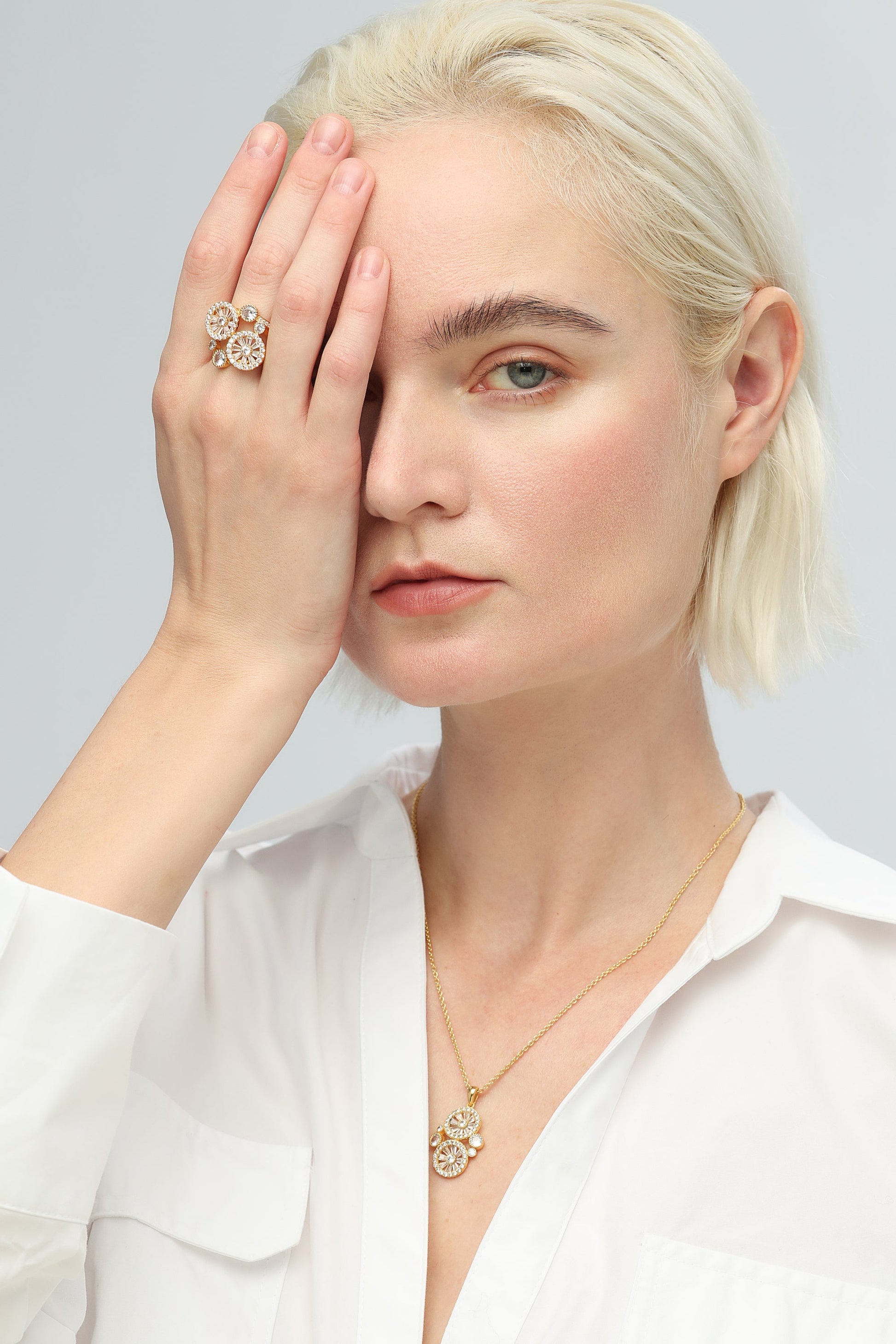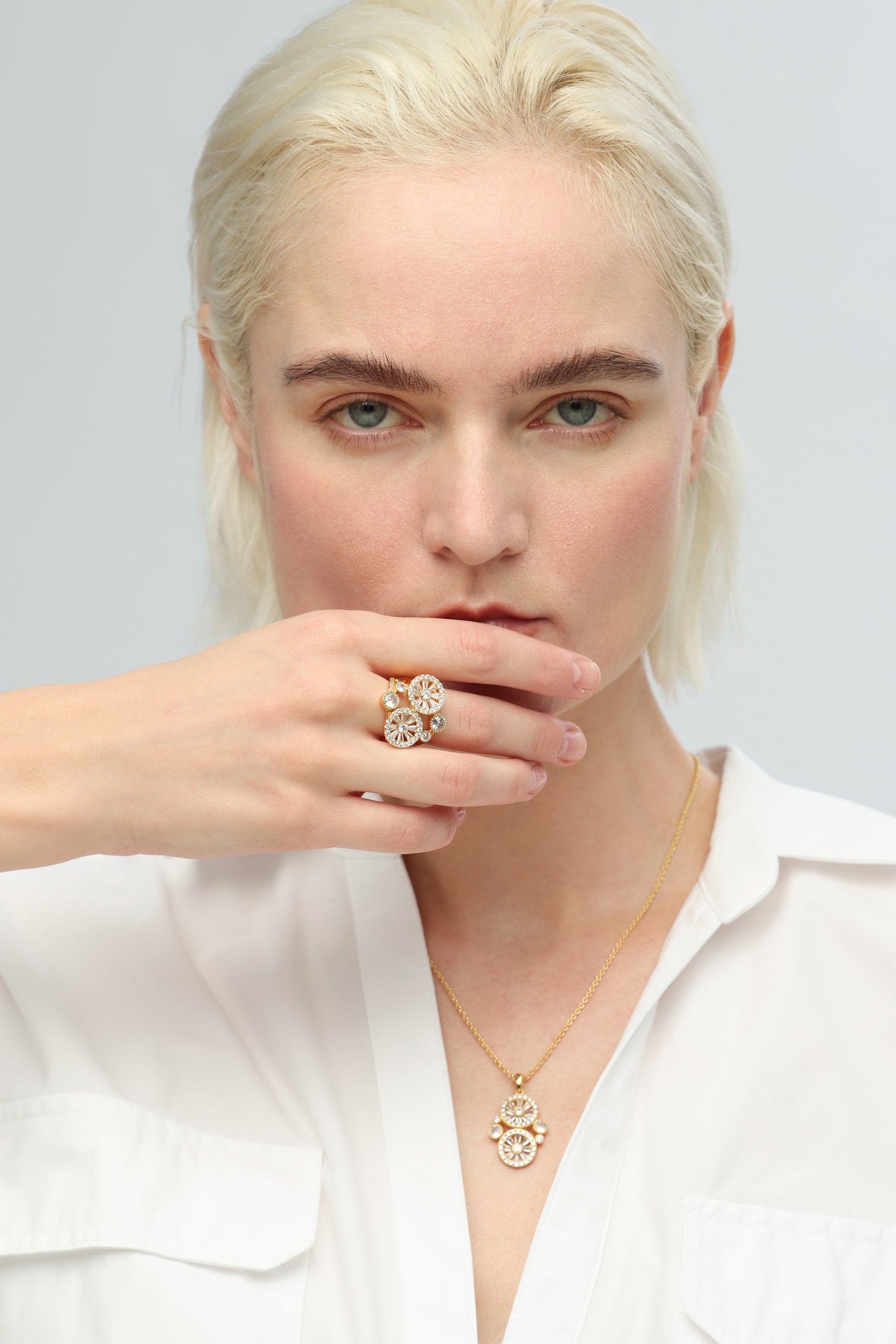 Inspired by the interpretation of “The Wheel of Fortune", this ring is absolutely special and stunning! It showcases wheel design and sparkling pavé-set cubic zirconia that dazzle in their beauty and cause a stair. The unique design is both refined and playful, and an essential addition to any jewelry box. Pair with the wheel of fortune necklace for a full matching set. Both necklace and finger ring are available in gold and silver.