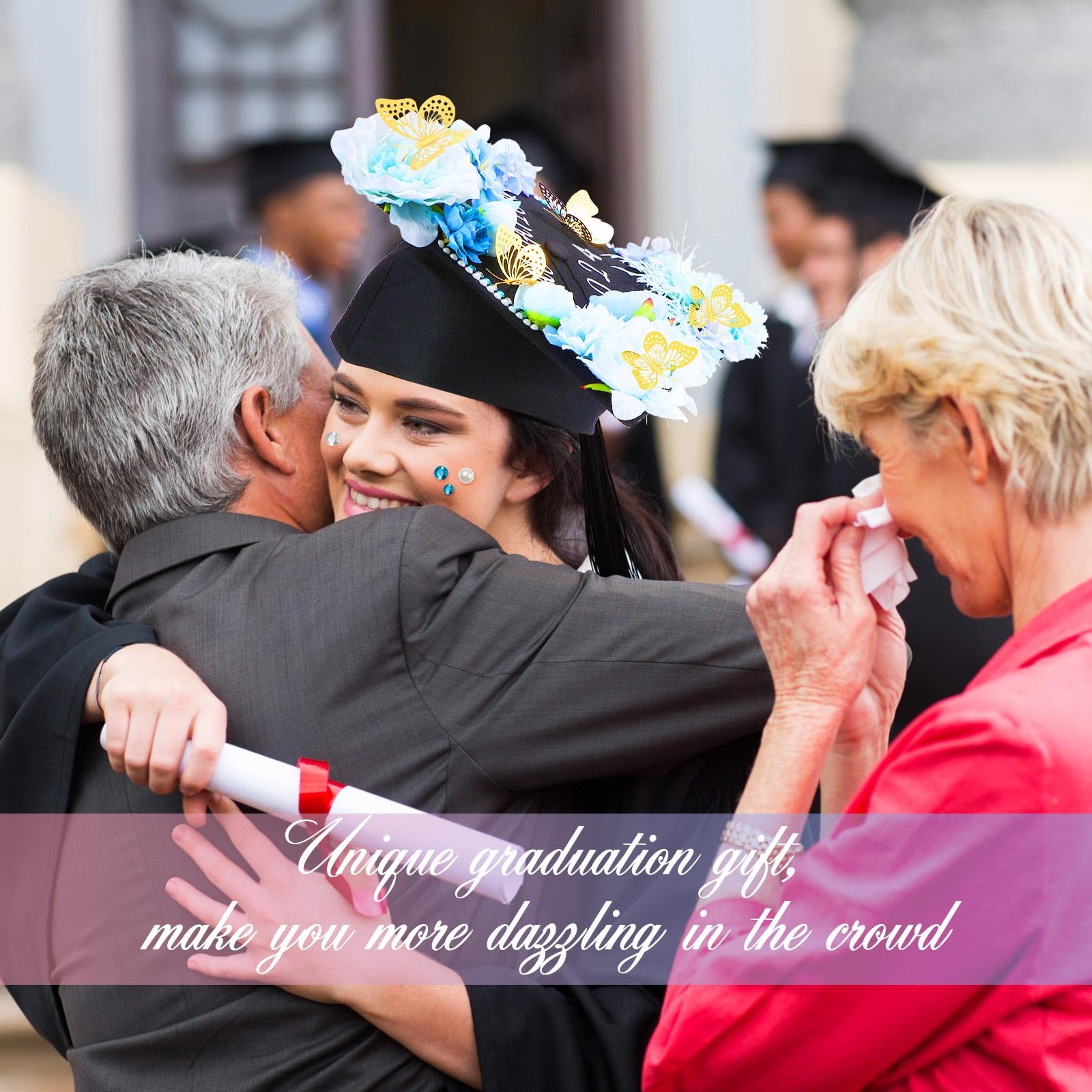 Hoteam Graduation Cap Decorations Kits Included Faux Flower Heads 3D Butterfly Stickers Self Adhesive Rhinestones Glitter Alphabet Letter Stickers for Grad Cap Topper DIY Craft Art Decor(Blue)