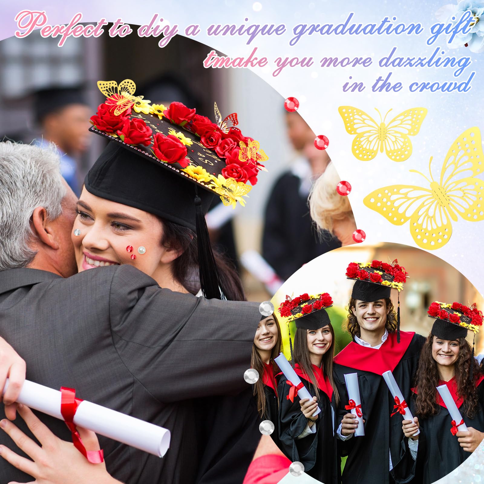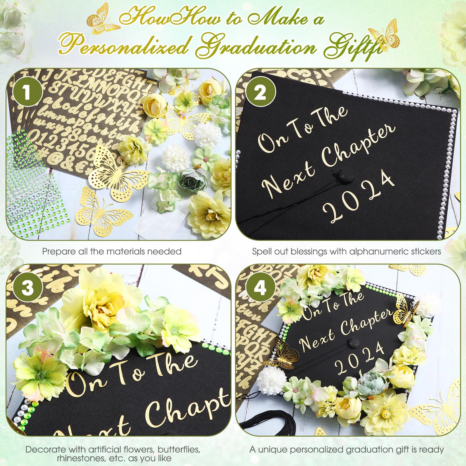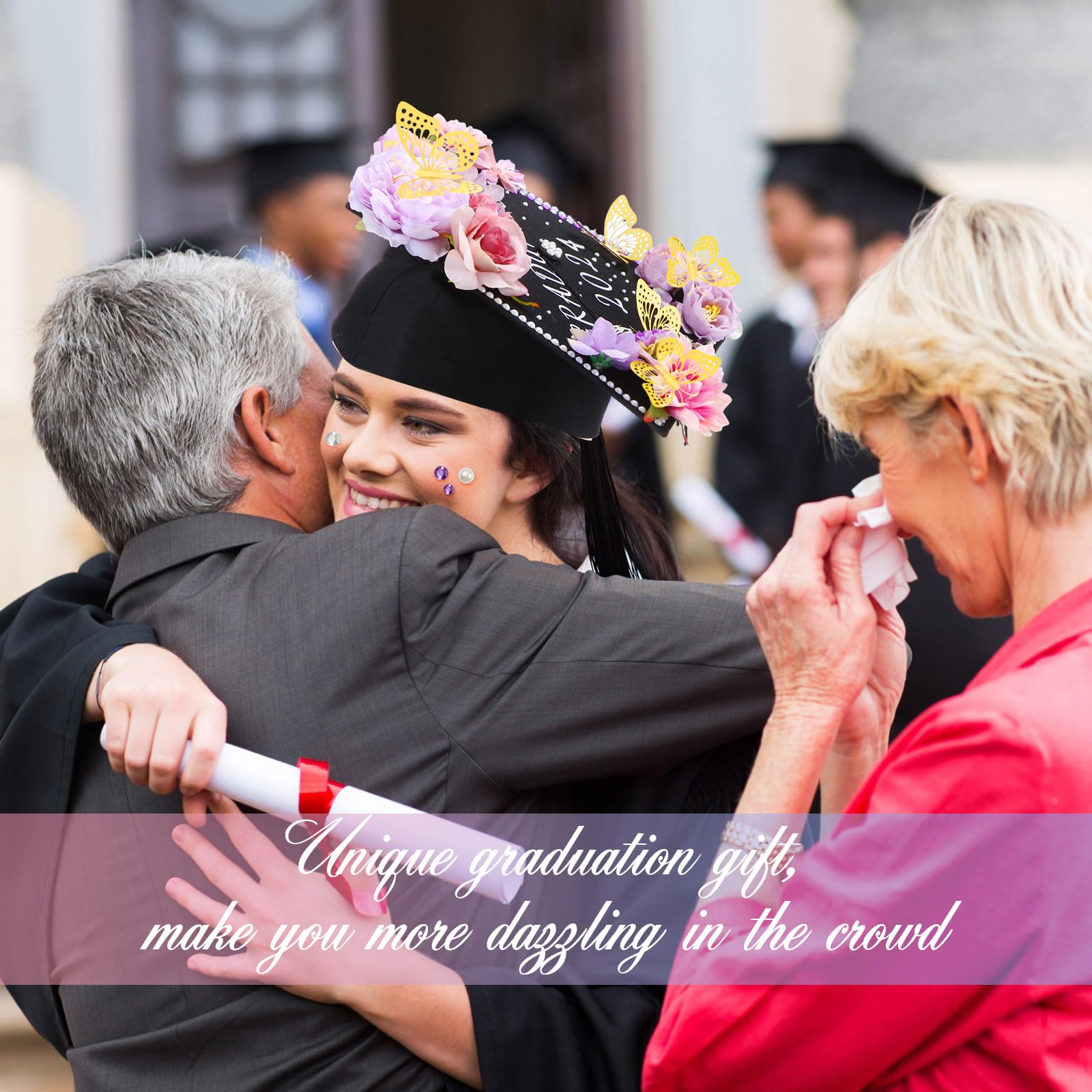 - The Fun of DIY: the cap decorations for graduation kit are designed with various glitter and delicate stickers, and you can use them to decorate your graduation cap; You can use letter stickers to spell out names or words of blessing, and then decorate it with the flowers and butterfly stickers