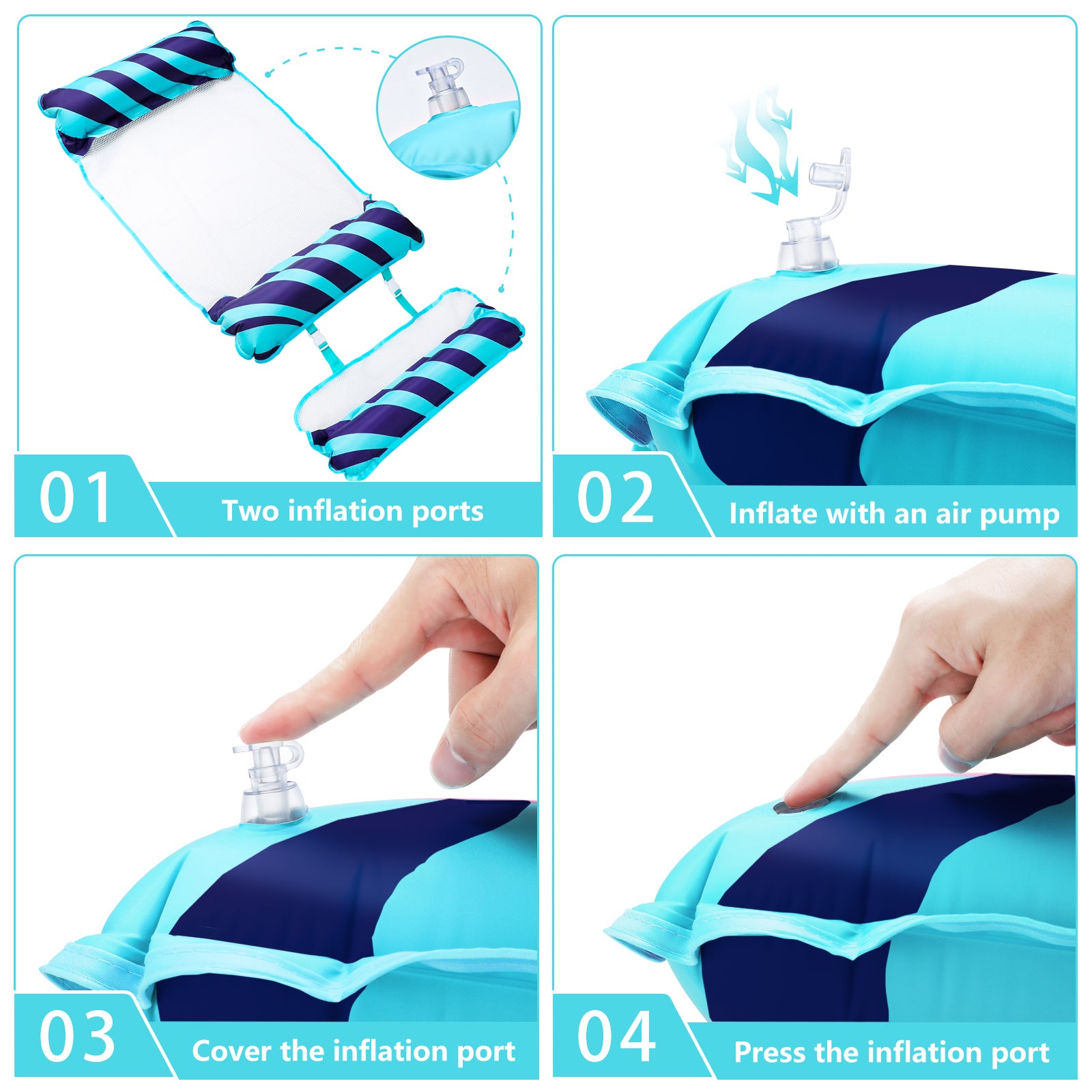 【Quick Inflate, Easy to Carry】Pool floats are easy to inflate and easy to deflate, you just need to inflate each end, no need for a pump to inflate easily and quickly, so it's fast and easy. And the overwater hammock folds up small enough to carry around, making it perfect for travel.