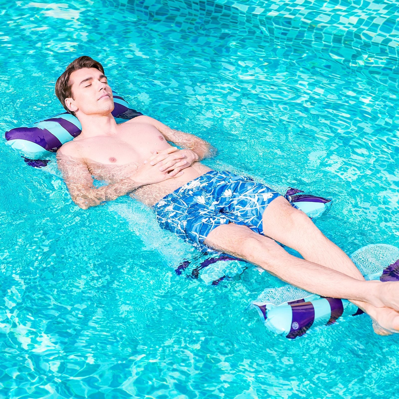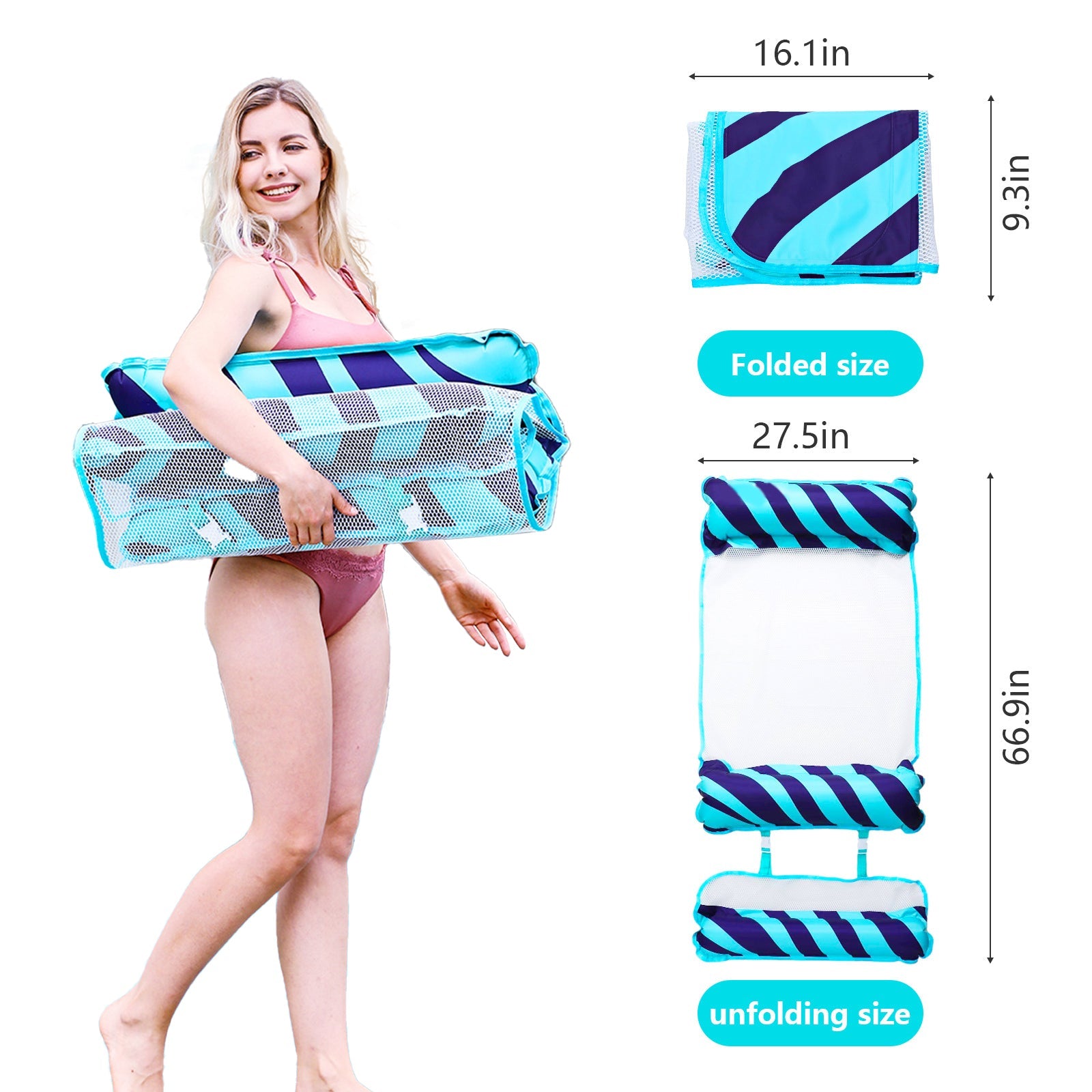 【Comfortable and Durable Material】Made of high-quality eco-friendly PVC and nylon mesh, the soft and comfortable mesh swimming pool floats in the water with inflatable airbags at both ends, which are ergonomically designed. Durable and stitched with high-quality mesh. Unlike most other pool hammocks (where the pillows are attached with a mesh), the pad is tear-resistant, soft, and safe.