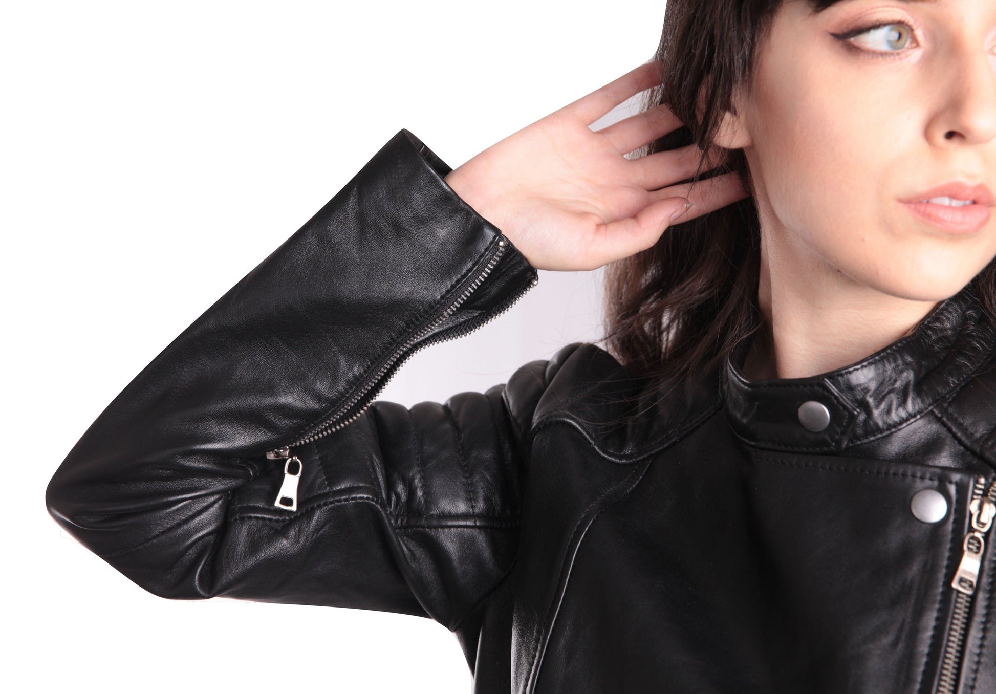 Beautiful Black Cute Leather Leather Jacket 100% Sateen Lining Casual Jacket Delicate style which is highly fashionable and can be worn for all occasions. Exotic and Hot Leather Bold Zippers. 100% Supple Lambskin Leather.