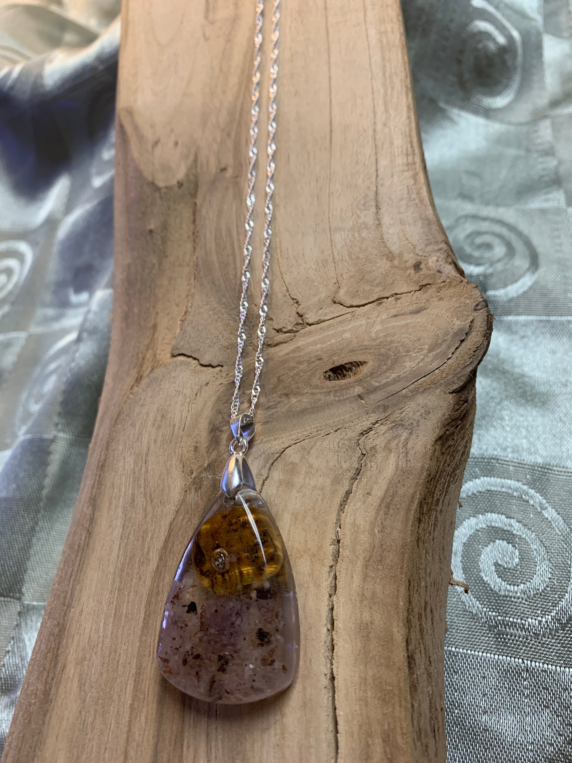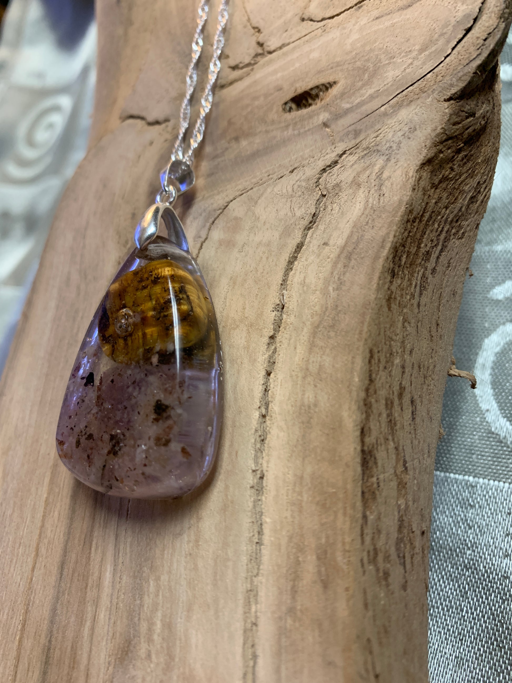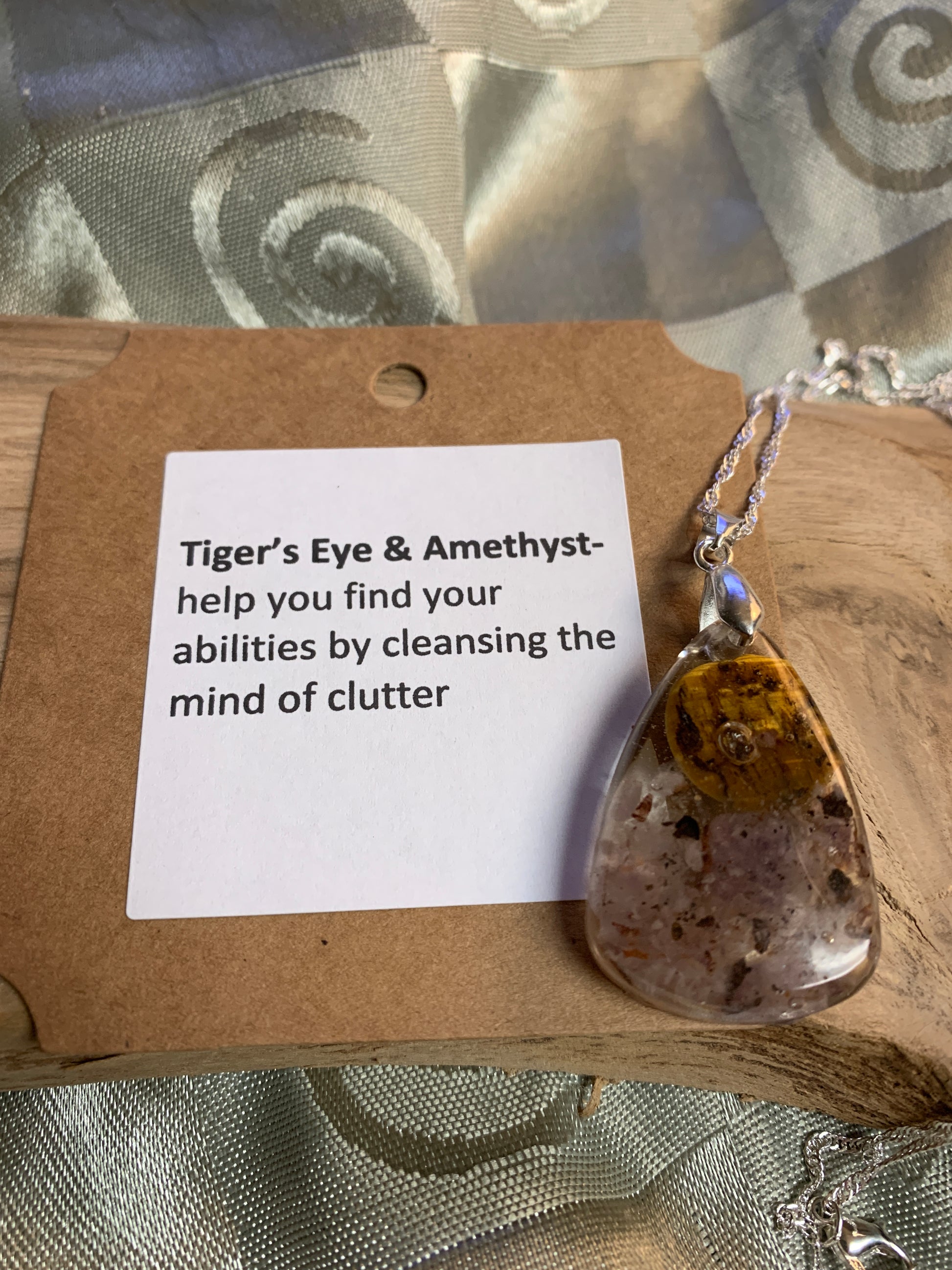 Tiger’s Eye & Amethyst-help you find your abilities by cleansing the mind of clutter. This long oval shaped pendant shows off the two stones and is encased in non toxic resin. Pendant dimensions - 1.75" long / 1.0" wide. The silver twisted rope chain is 20 inches long.