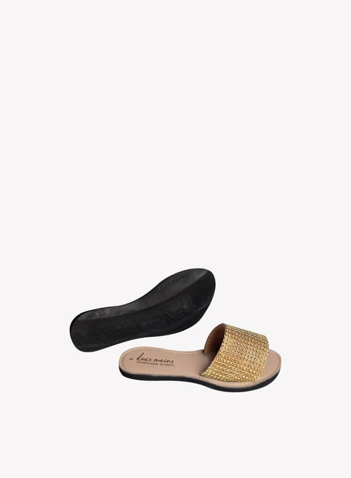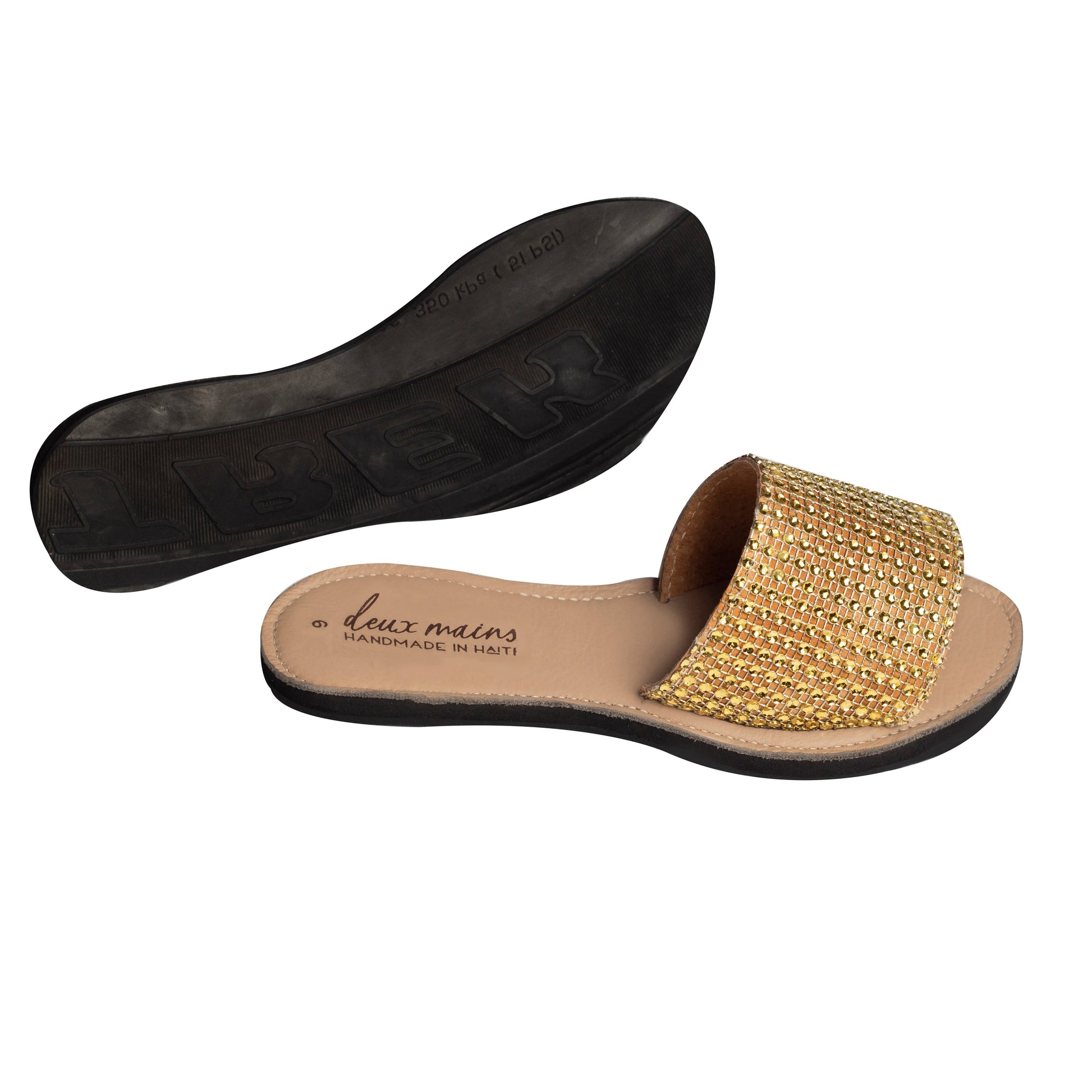The Love Wins Slide was inspired by our Founder's desire to kick off her heels and stay glam on her wedding day. Gold rhinestones glisten under the lights, and our signature repurposed tire soles give traction on the dance floor.
