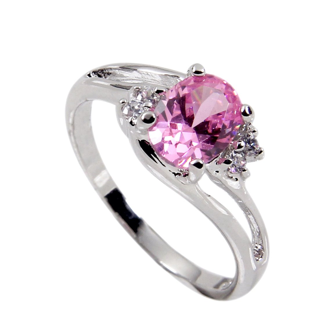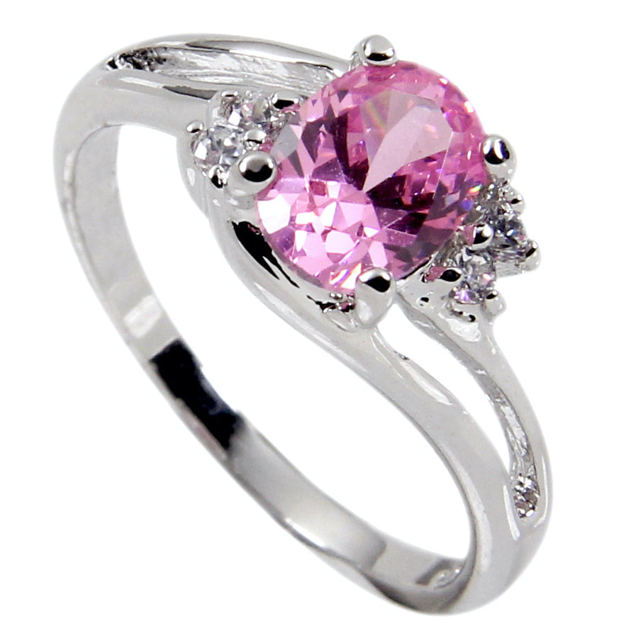 This is what we call the perfect size ring because the stone on this ring is neither too small nor too big. This is a great ring to wear everyday or as an engagement ring. This ring is unique because of its offset twisted shoulder that holds the pink center stone in the middle, along with the two round clear cubic zirconia side stones on each side. The pink cubic zirconia center stone is about the size of a one carat diamond and the clear side stones are about 2 mm wide each. All stones on this ring are prong set by hand. The sterling was rhodium plated to add wearability and shine so that the ring will not tarnish. 925 metal stamped.