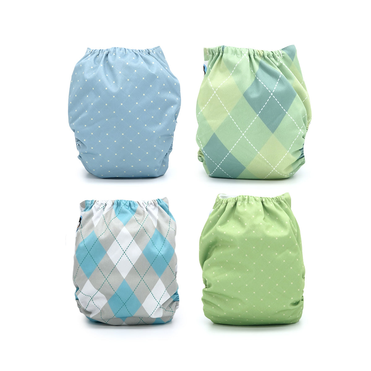The Regent Street cloth diaper collection includes four pocket diapers in the prints Wellington, Harper, Fairway, and Oxford. Four 3-layer microfiber inserts are included.