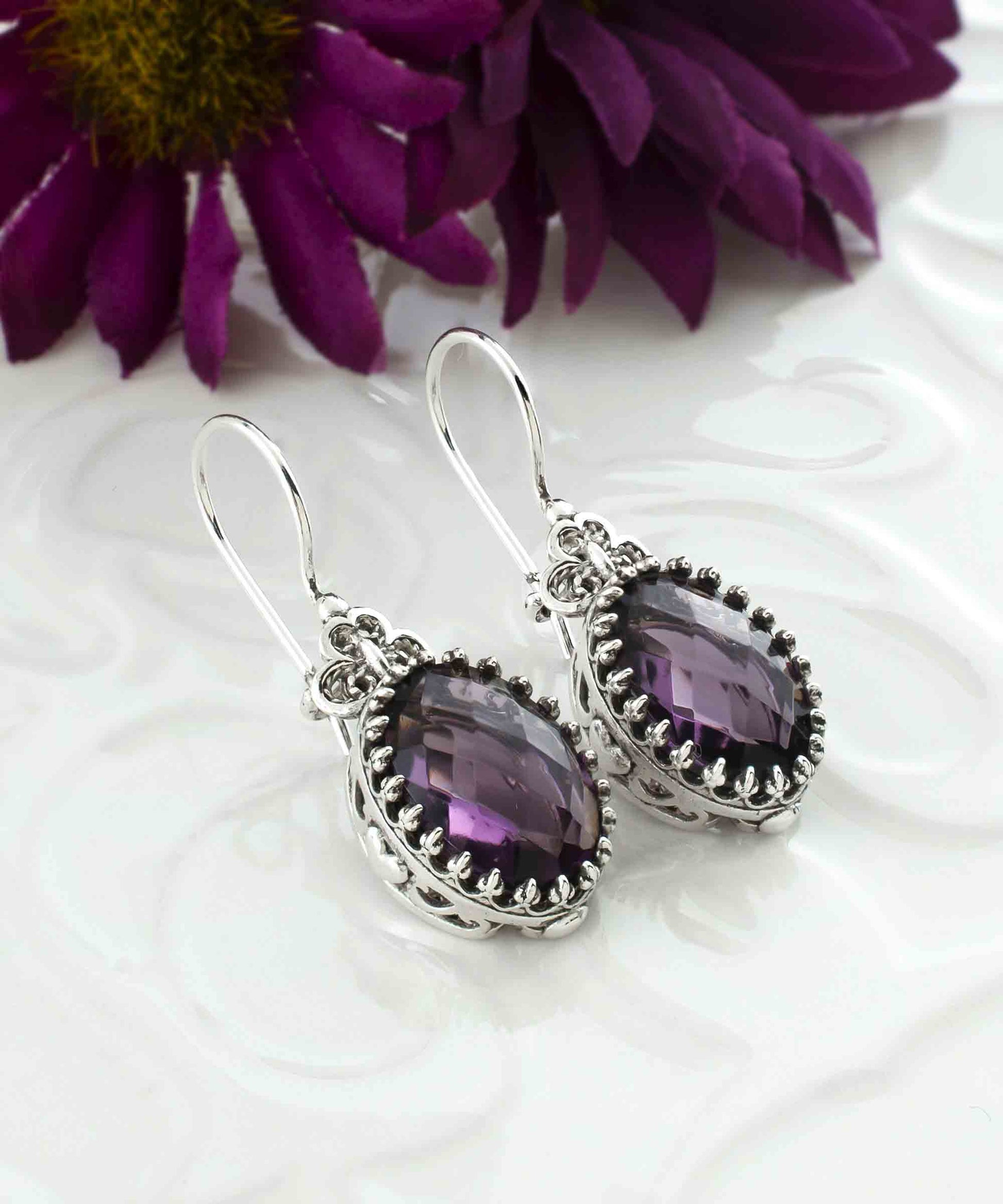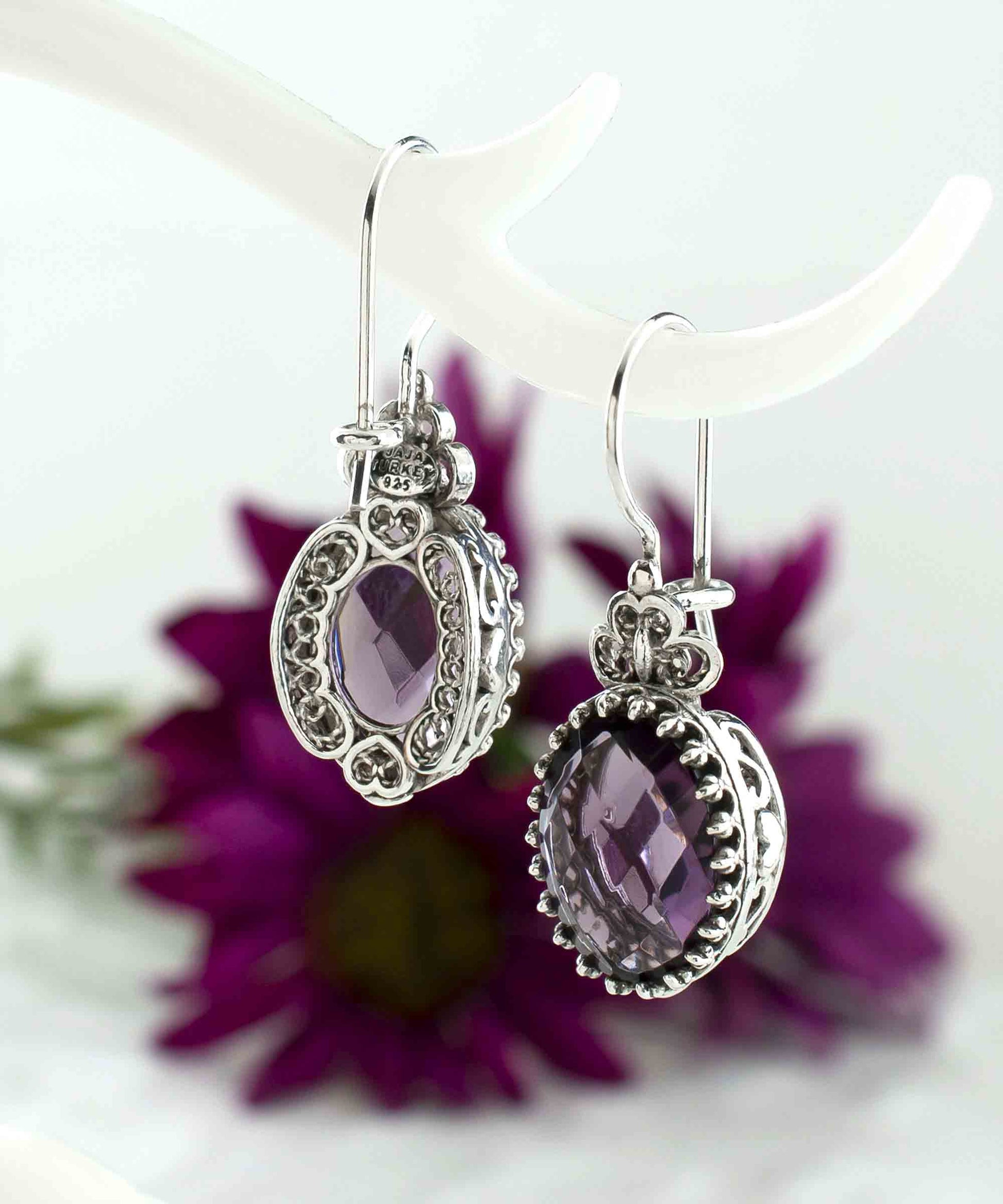 Make a statement with these stunning 925 sterling silver filigree art heart detailed figured, February birthstone amethyst gemstone mounted women oval drop earrings. Featuring a double-sided faceted 10x14 mm oval cut amethyst gemstone, these earrings are sure to catch the eye and add a touch of elegance to any outfit.