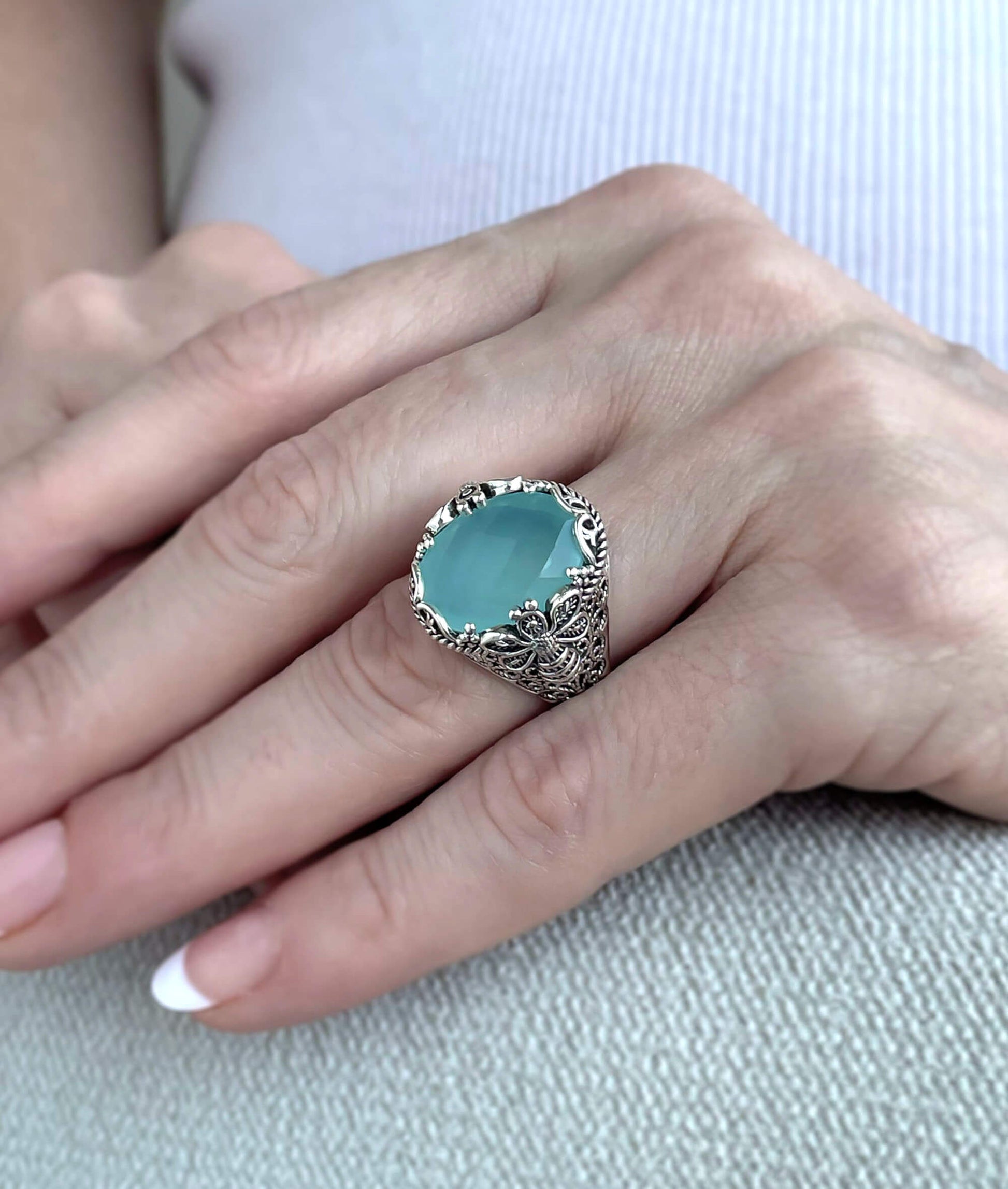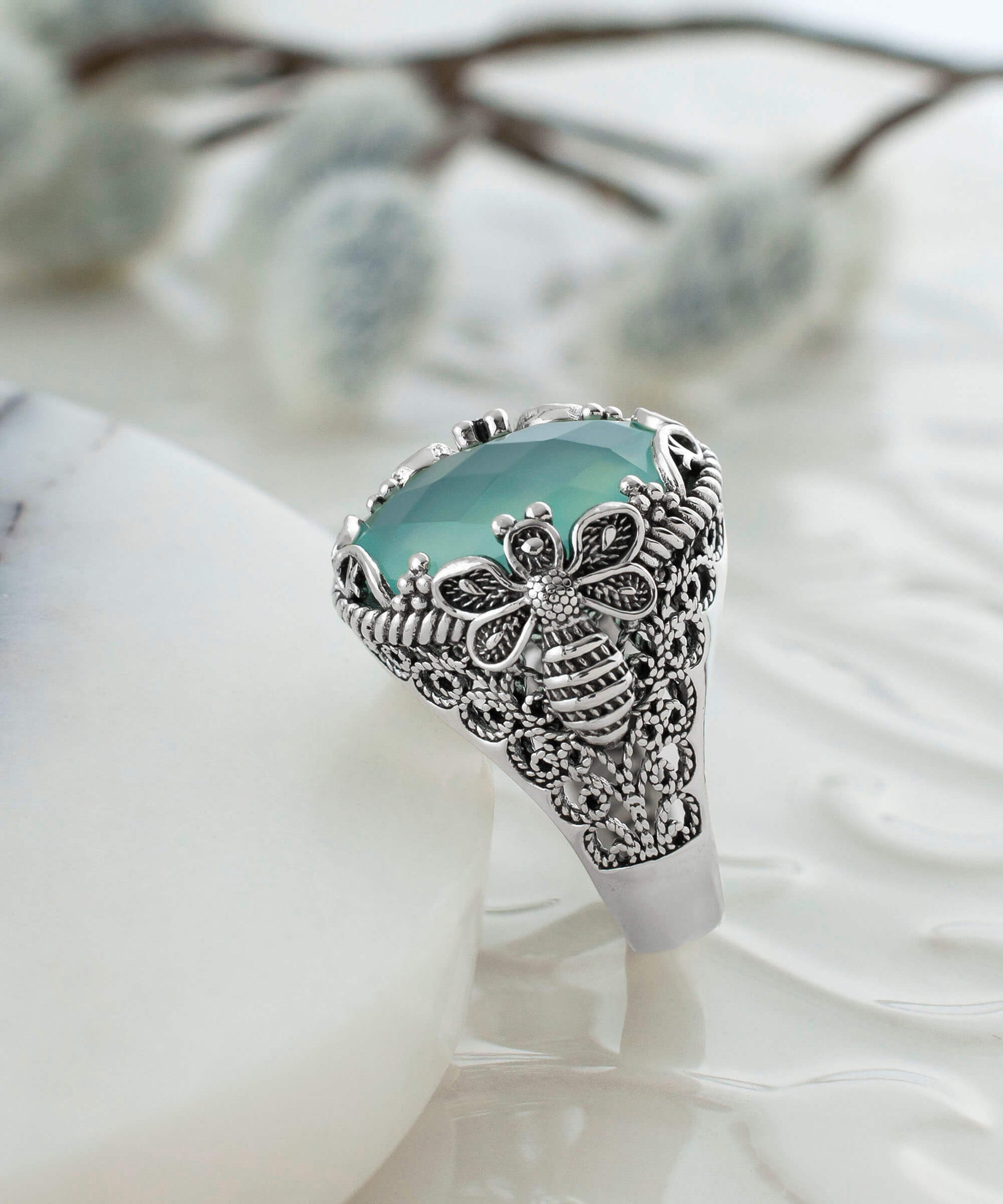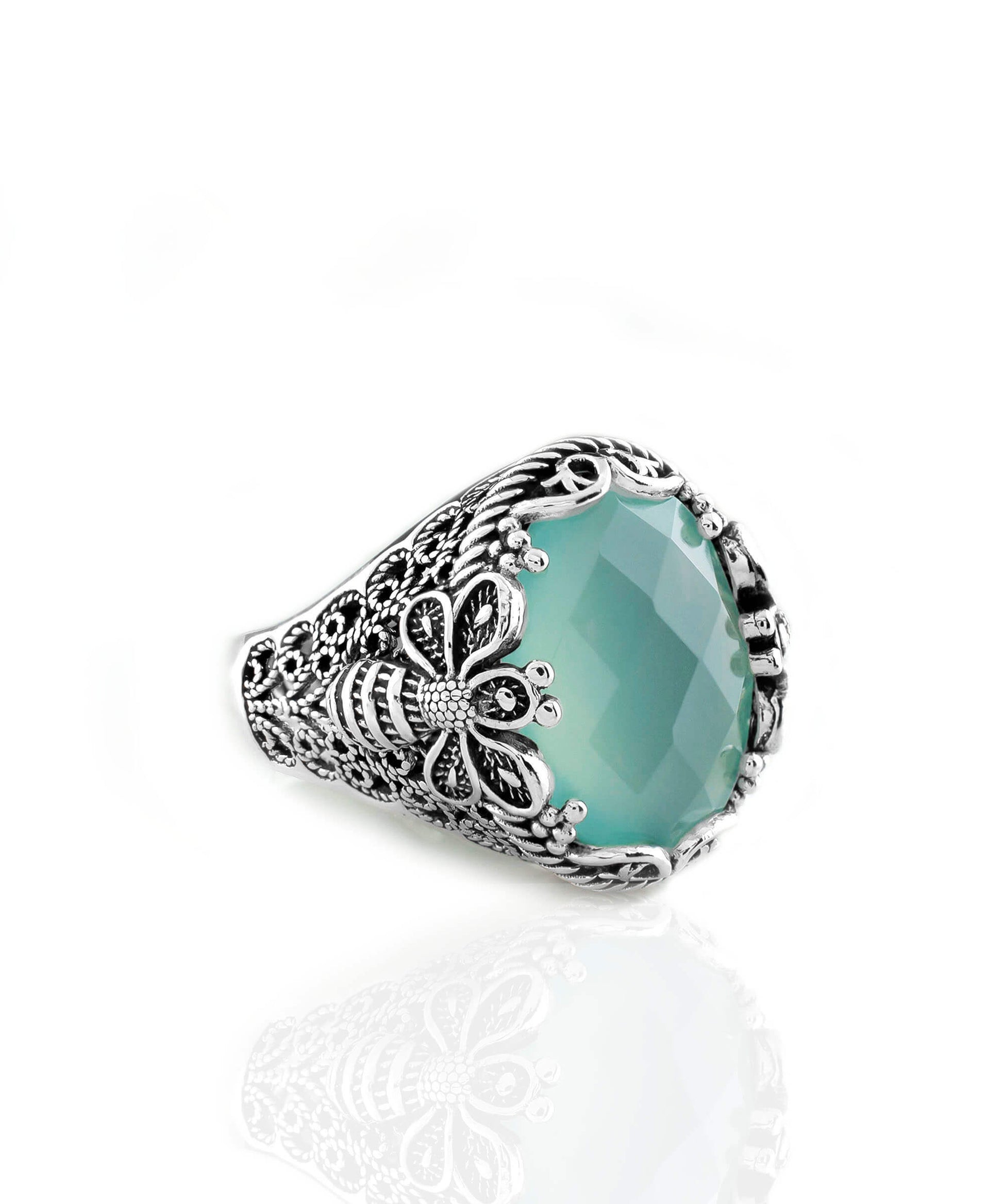Filigree Art Bee Detailed Aqua Chalcedony Gemstone Women Silver