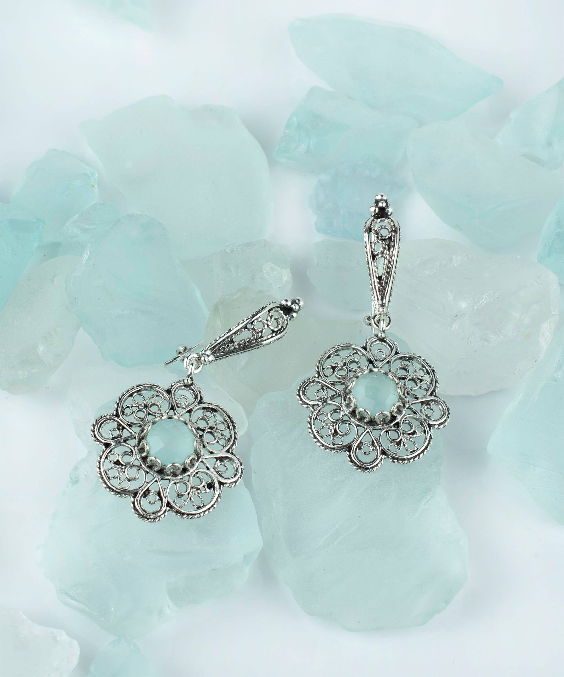 The Handmade 925 Sterling Silver Filigree Art Aqua Blue Chalcedony Gemstone Sun Figured Women Dangle Drop Earrings are a stunning piece of jewelry. These earrings are made with high-quality 925 sterling silver, crafted by skilled artisans with intricate filigree art in a sun figure pattern.