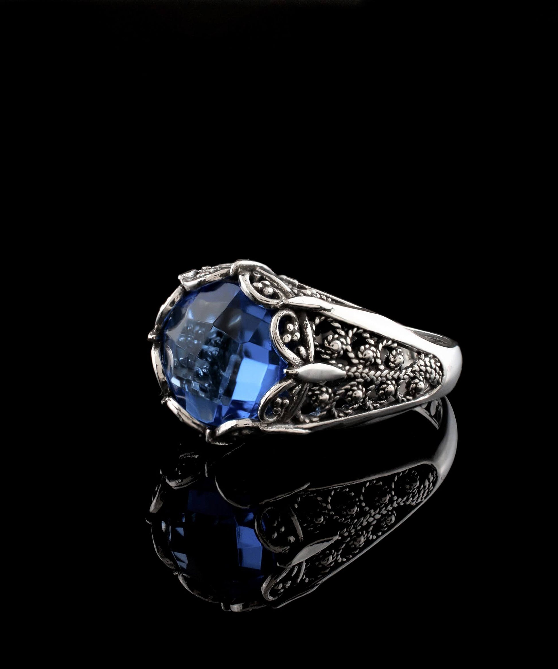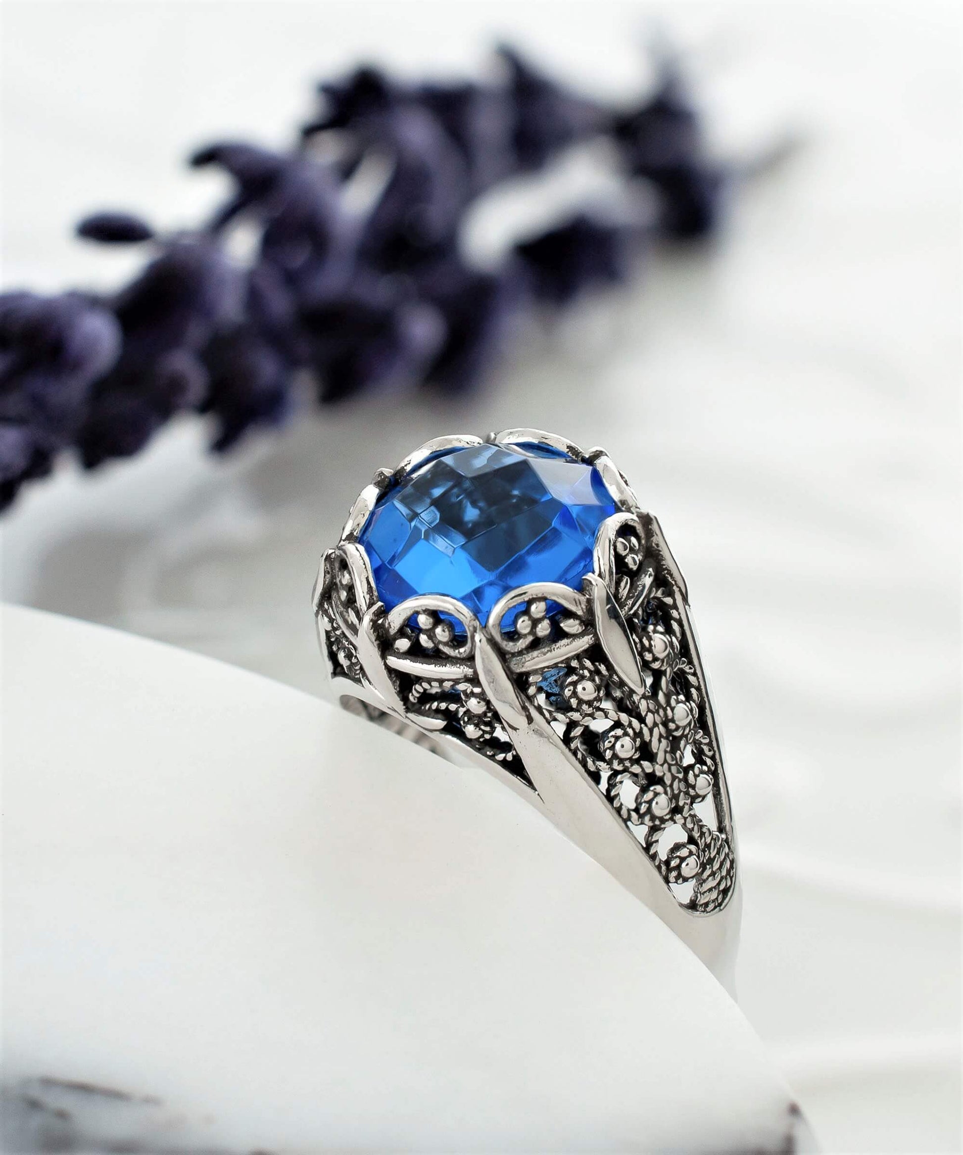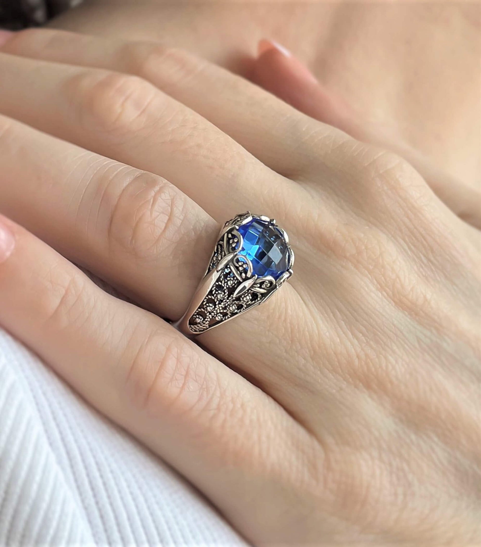 This exquisite ring is sure to add a touch of luxury to your everyday look. Beautifully crafted with fine silver filigree and detailed embroidery, this ring is perfect for special occasions or just everyday glam. Featuring a blue quartz gemstone, it's a classic style that will never go out of fashion. Add this ring to your jewelry collection for casual or formal wear and enjoy wearing it for years to come. It will be your perfect option for thanksgiving gift, birthday gift, new year gift, Christmas gift, mother`s day gift or Valentine`s day gift for your loved one.