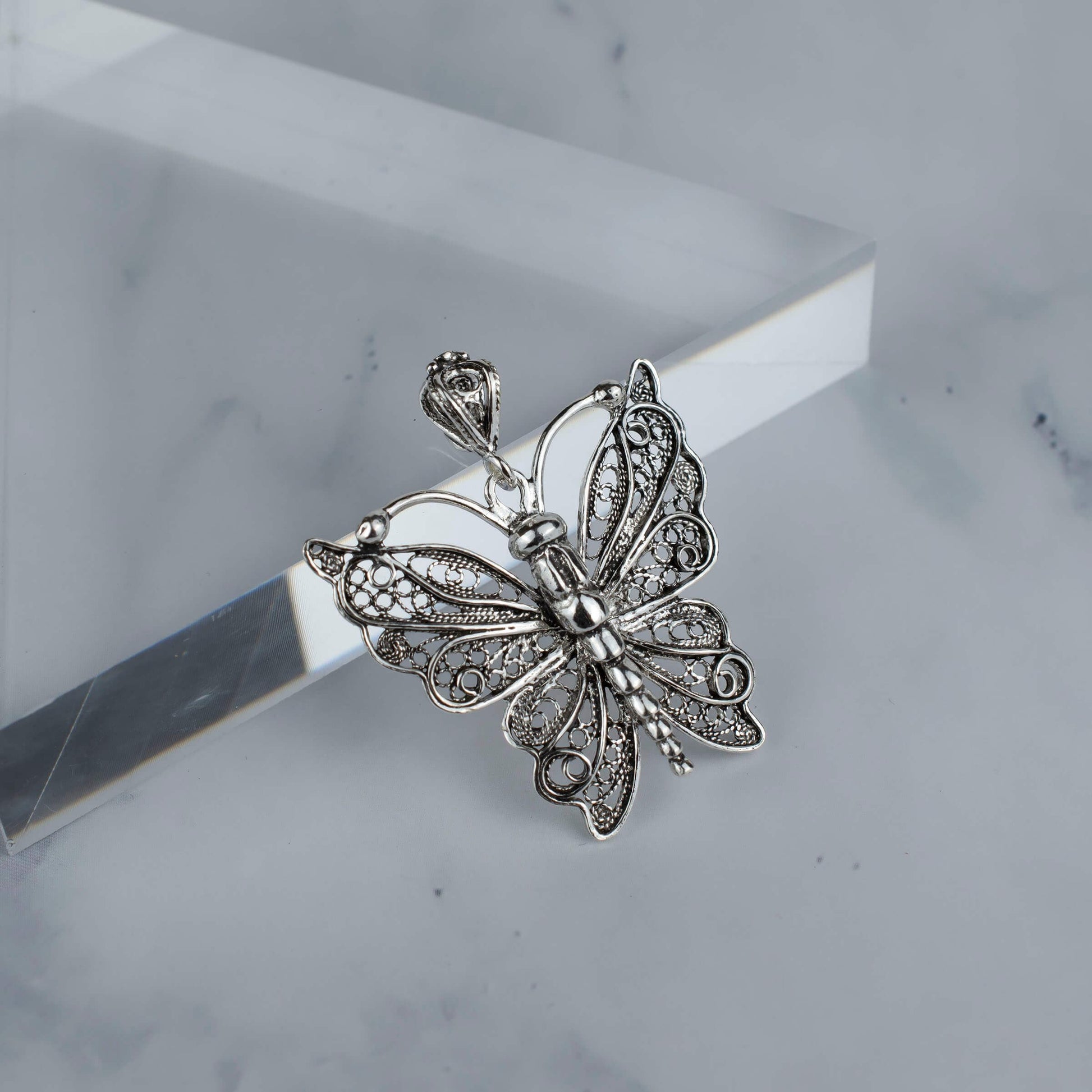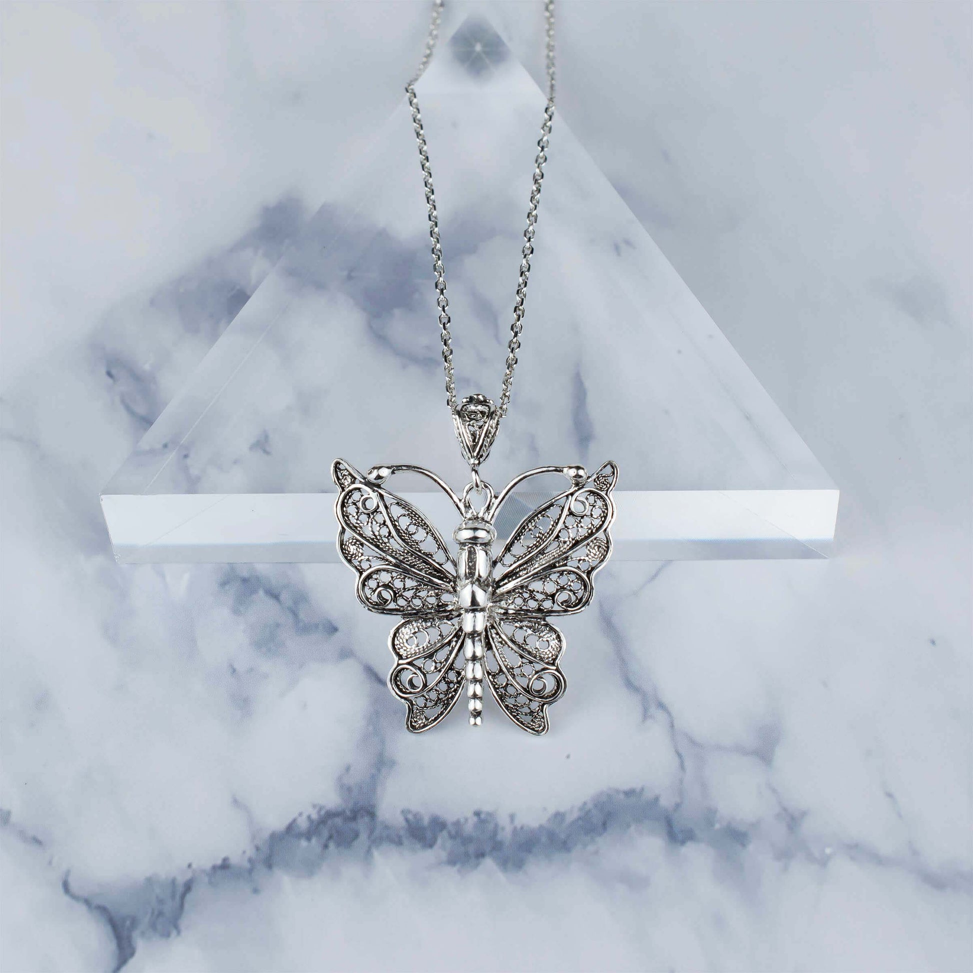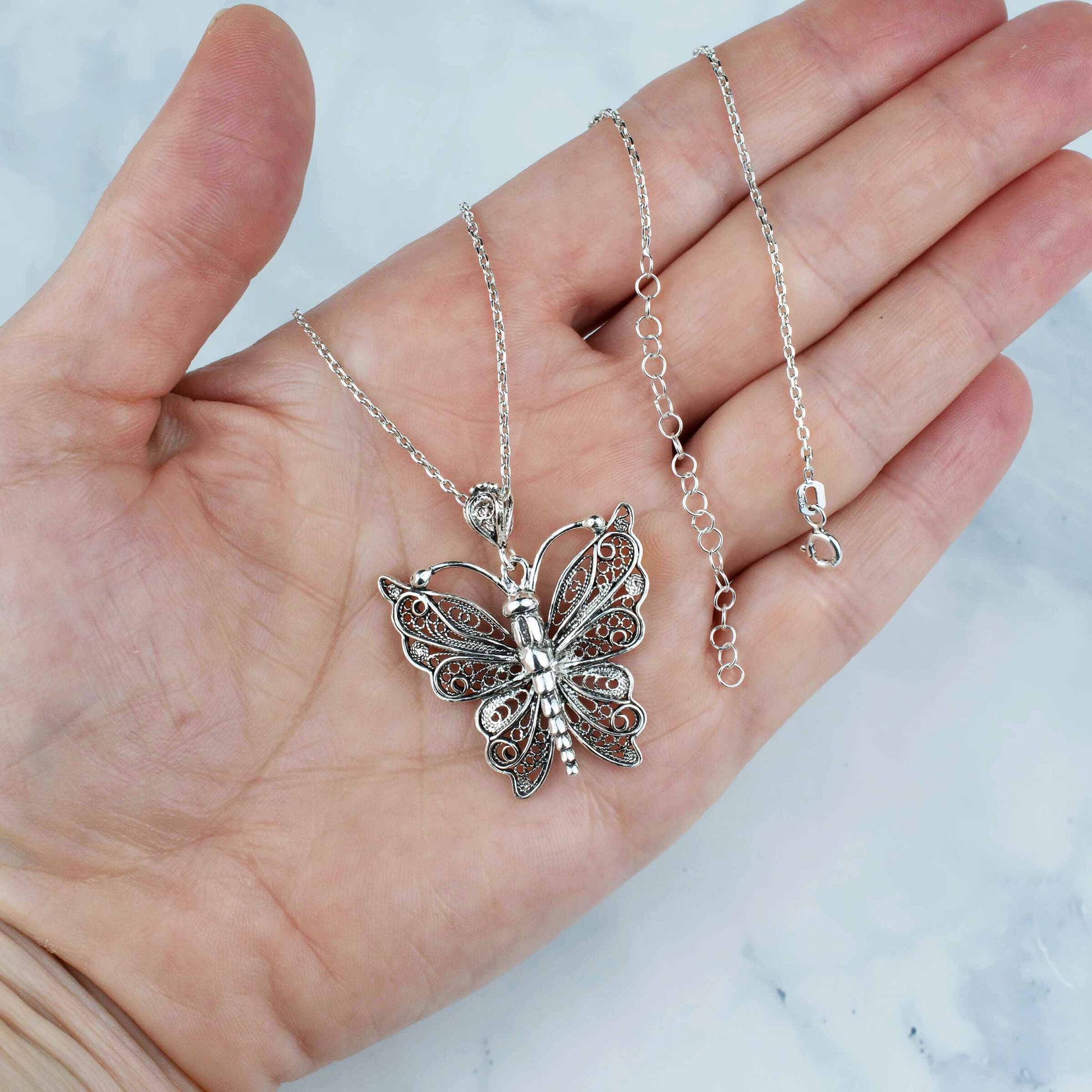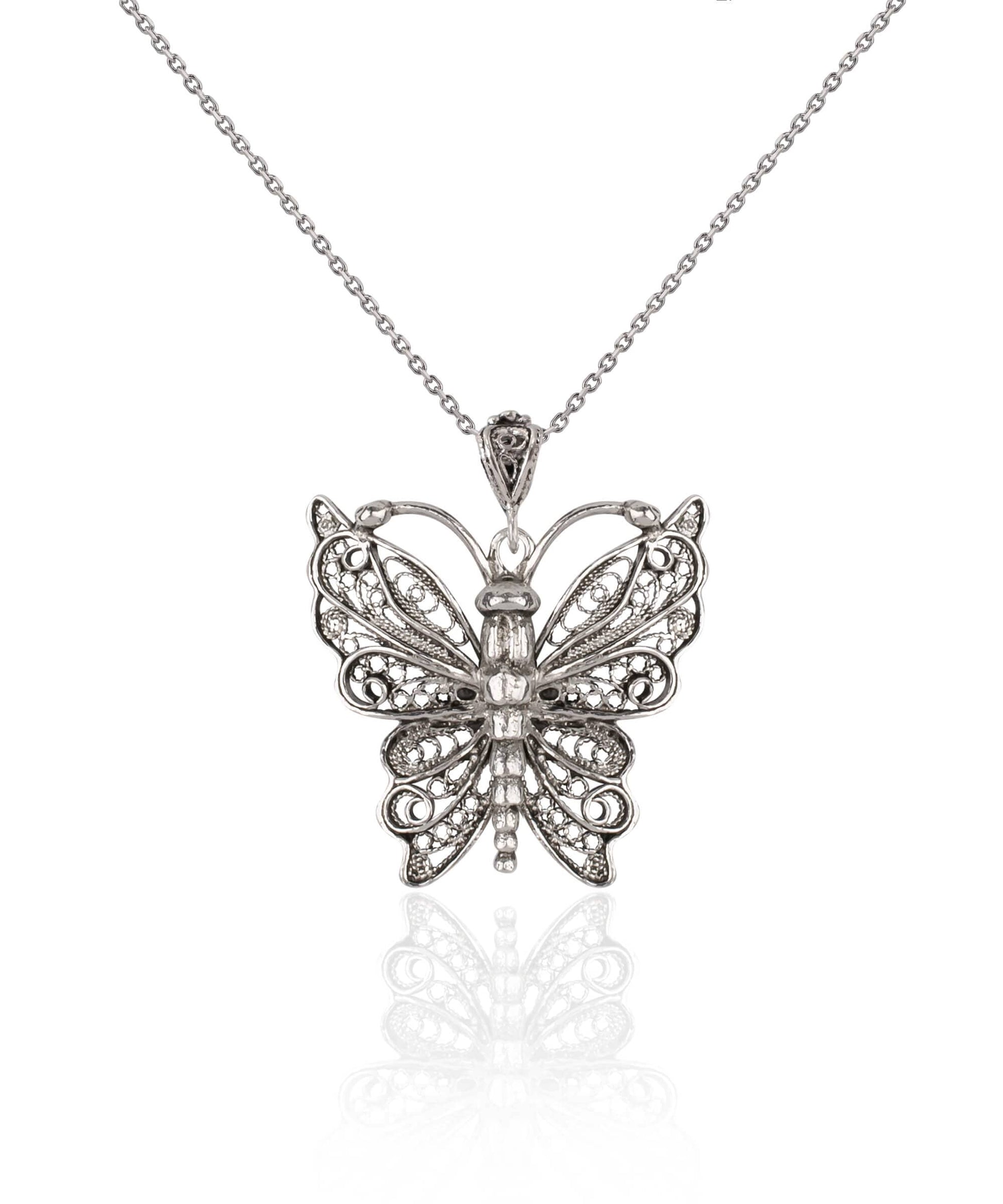 Add a touch of whimsy to your style with this Sterling Silver Filigree Art Butterfly Design Women Pendant Necklace. Featuring a beautifully crafted butterfly design made from high-quality 925 sterling silver, this necklace is the perfect accessory to complement any outfit.