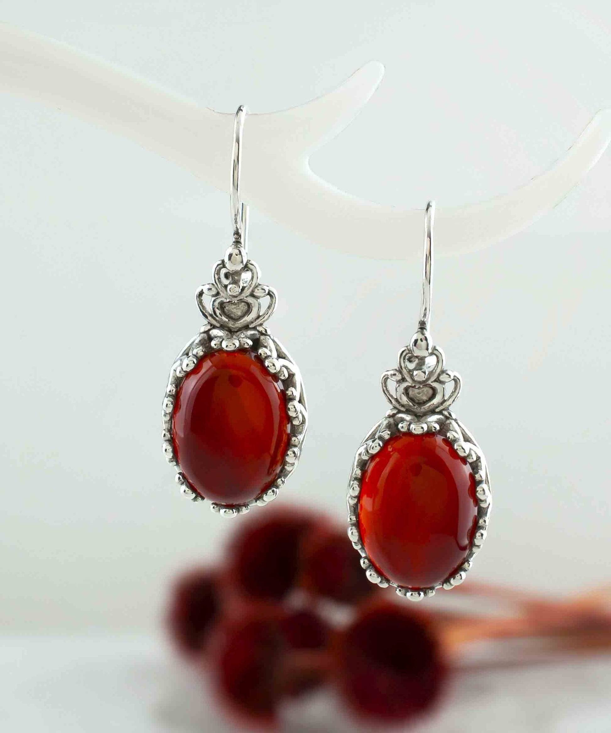 Filigree Art Carnelian Gemstone Crown Figured Women Silver Oval Drop