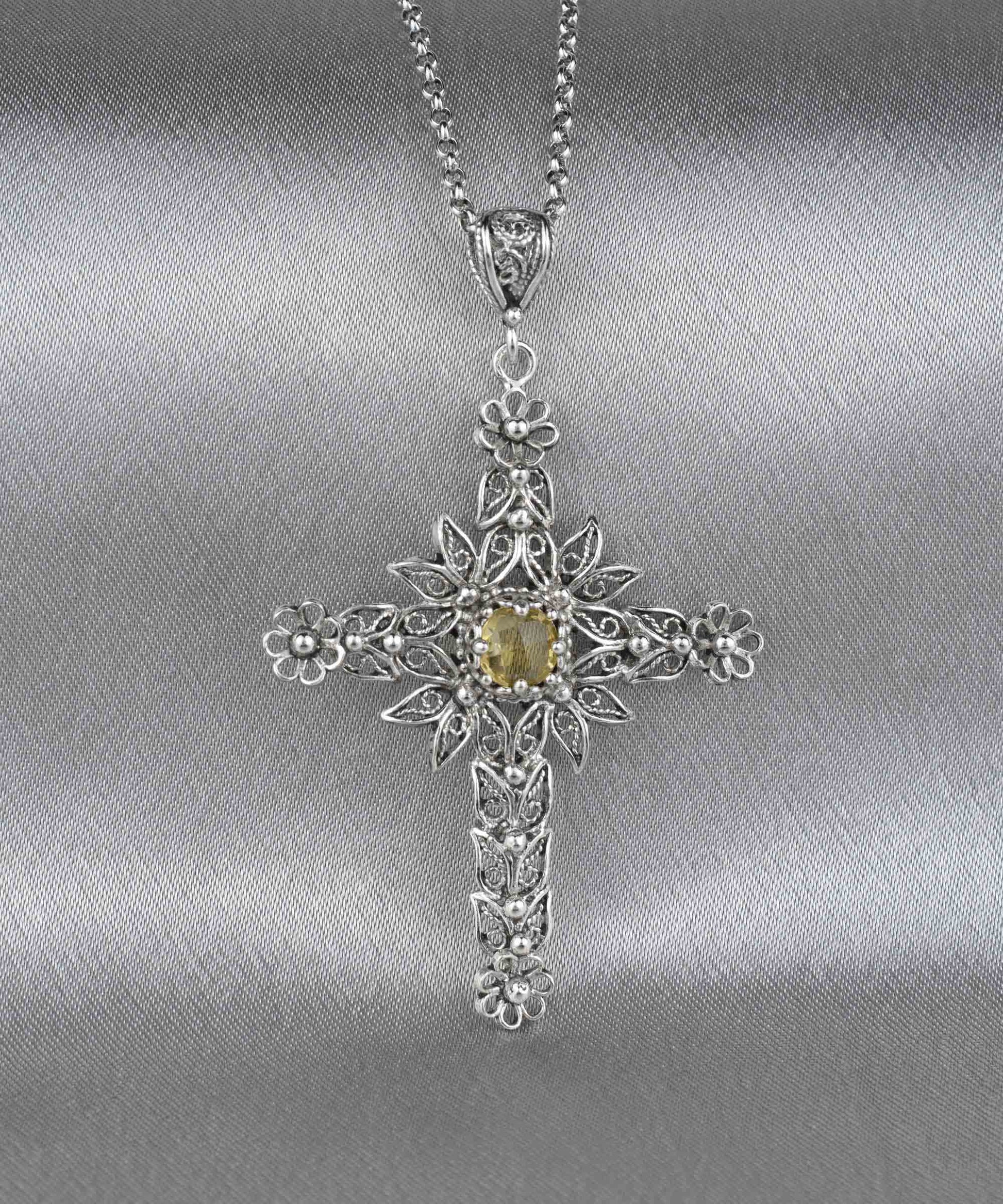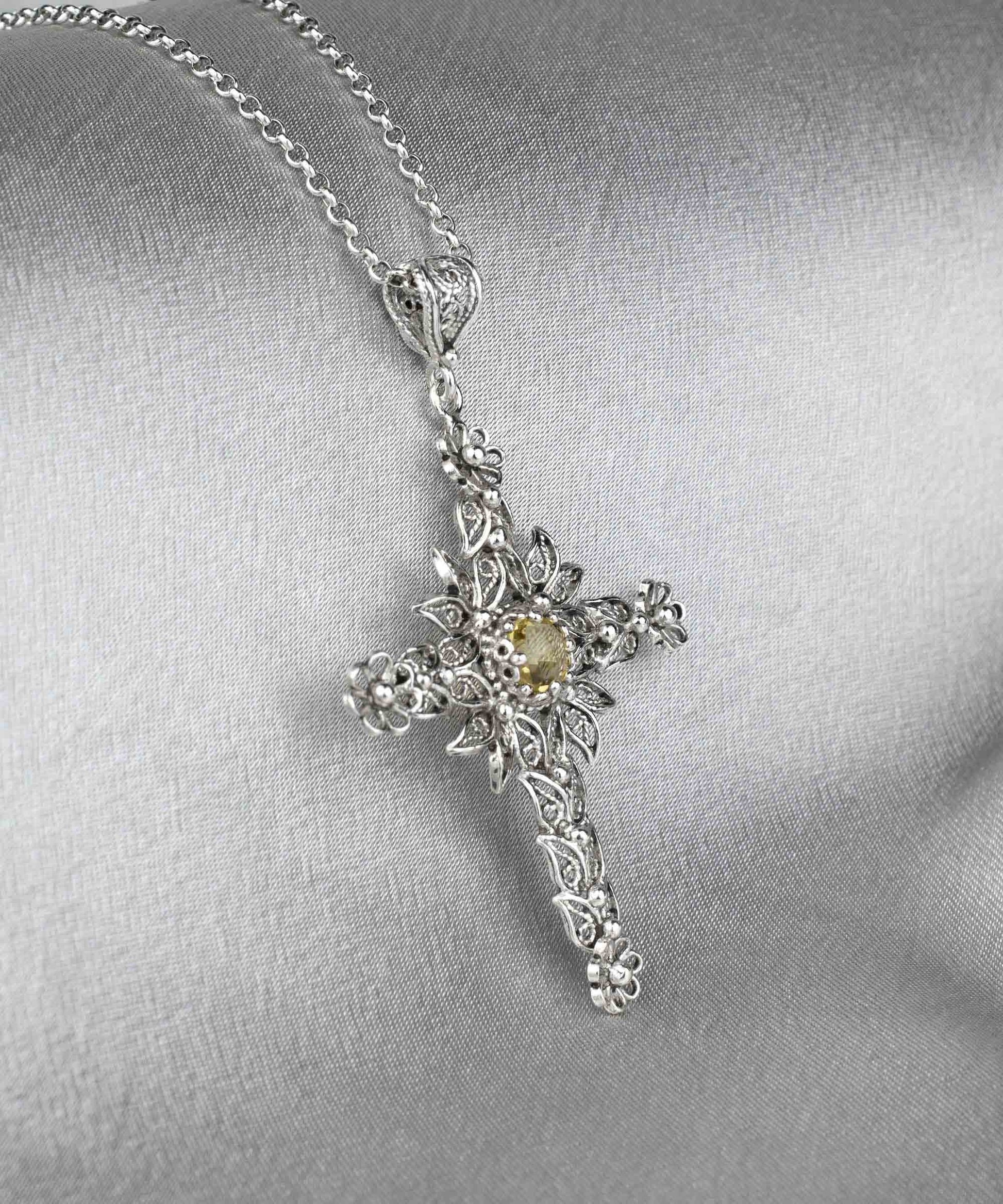 Simply put, the Cross is a Christian religious symbol that is said to represent faith, good fortune, and fortune. The cross pendant is thought to shield the wearer from harm, bring calm and peace, and ward off evil spirits. This handmade, solid silver filigree art cross pendant features Citrine gemstone. Beautifully crafted filigree art details inspired by nature and made by our artisan. It is going to be the perfect option for a Christmas gift, birthday gift, or baptism.