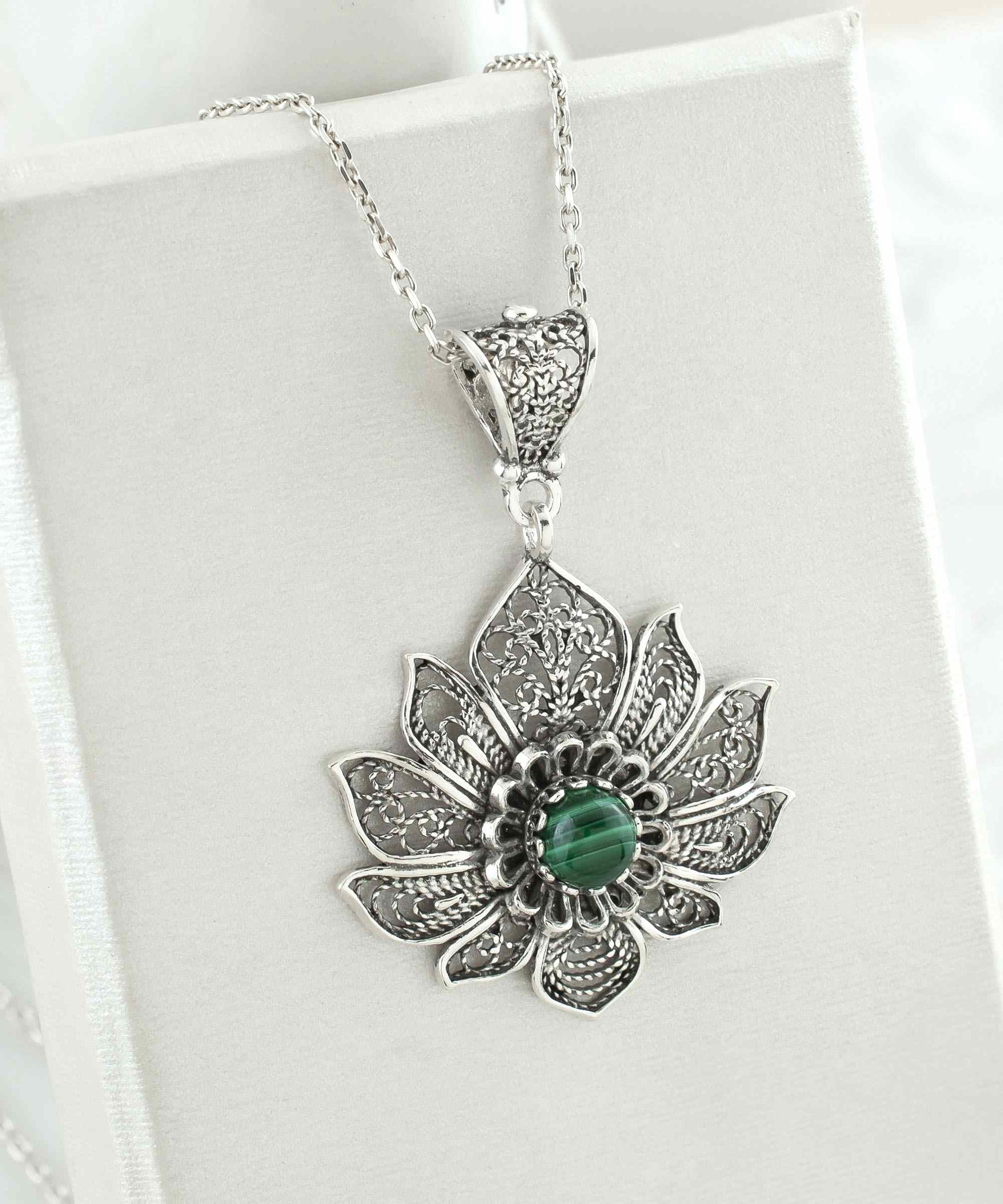 This 925 Sterling Silver handcrafted filigree art lotus flower pendant necklace with natural malachite gemstone comes with 20" silver chain option. Beautifully crafted filigree details will catch all eyes on you. It is going to be exact match to your daily wear. It can also be perfect option for valentine`s day, mother`s day or birthday gift for yourself or your loved one.