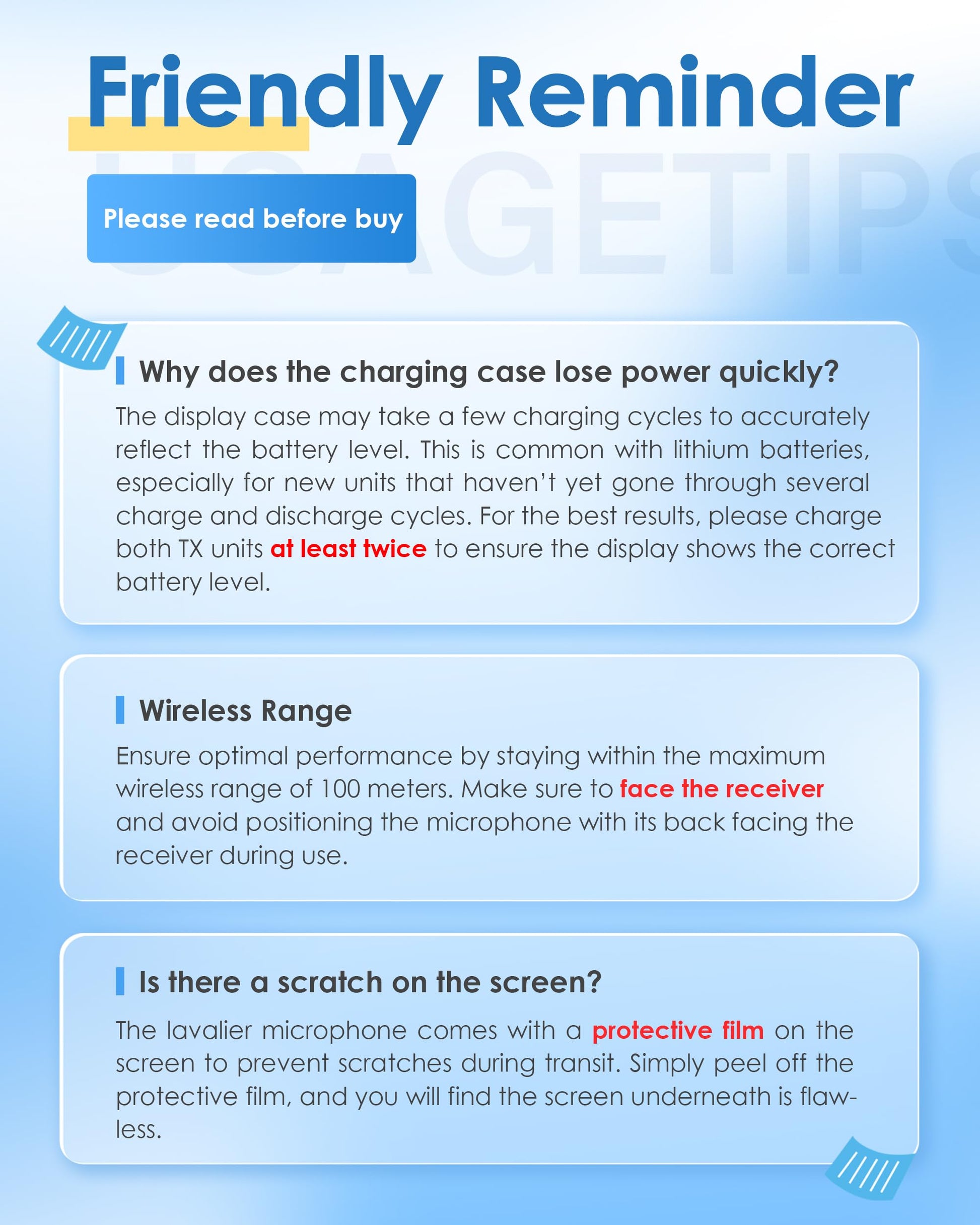 - 【Compatibility Notice】 For optimal performance, avoid using adapters or bulky phone cases, as they may hinder the mic receiver’s connection. Please confirm your device’s compatibility with the selected microphone model before purchasing.