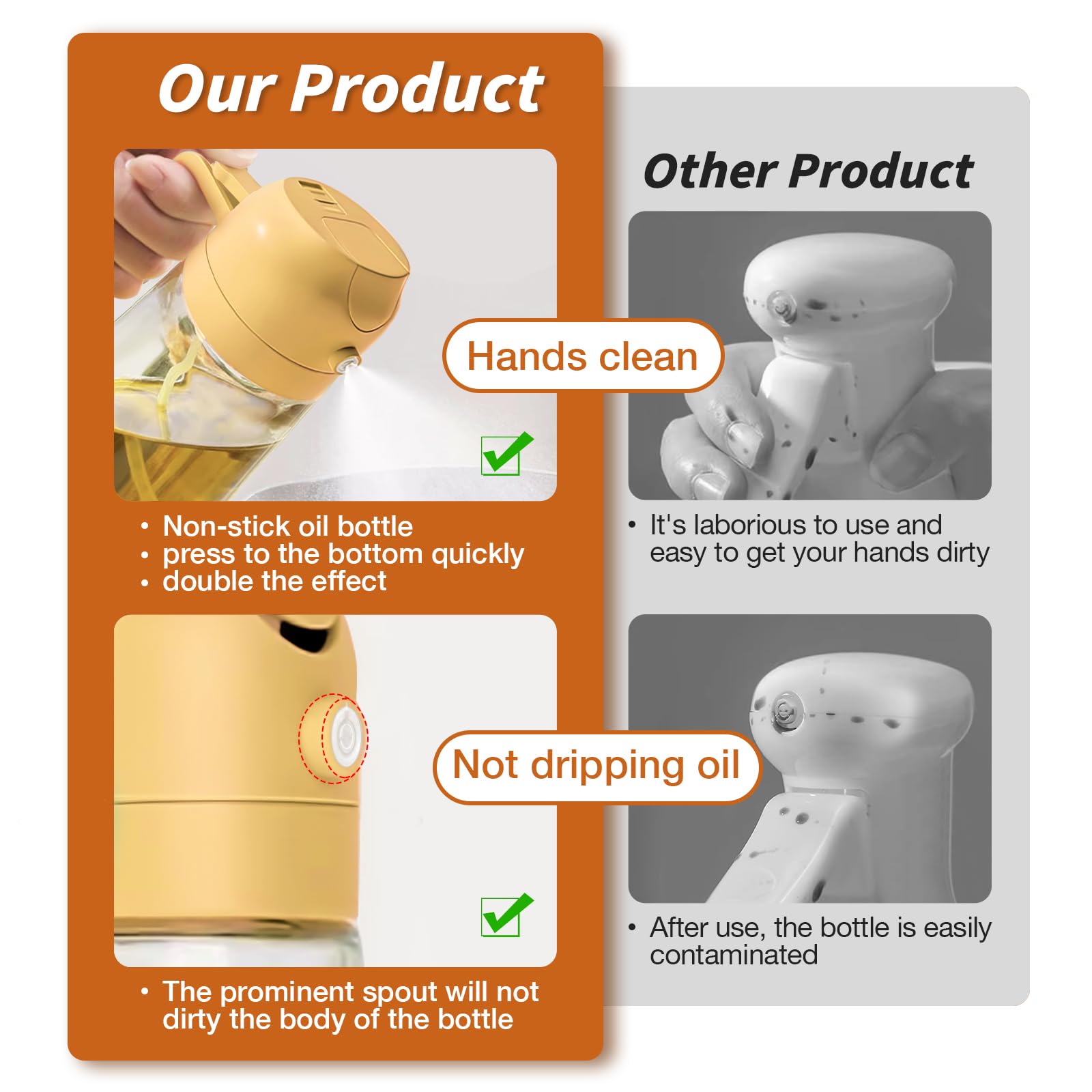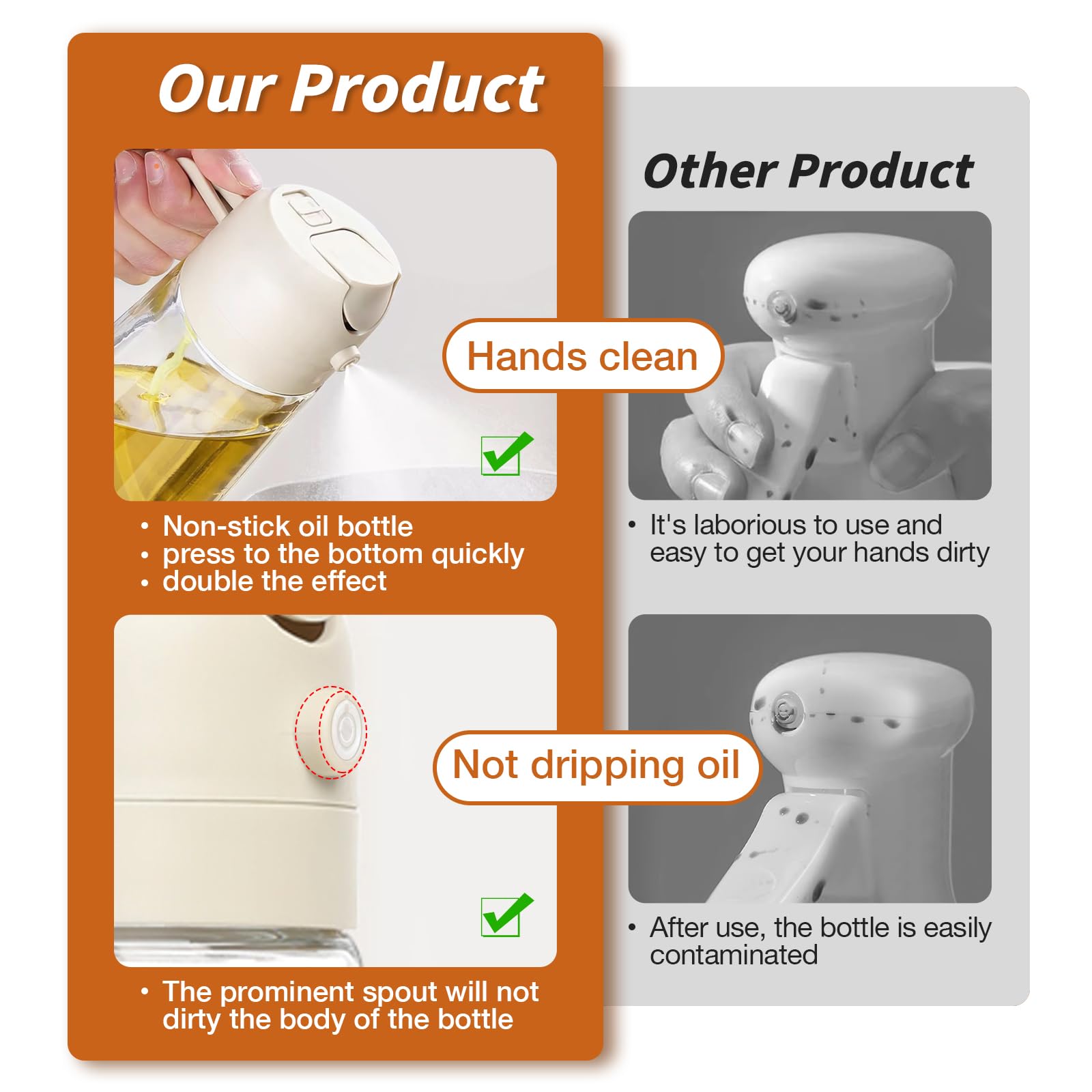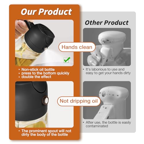 - Not Dirty Hands design: Olive oil spray bottle is designed to be leak-proof, and the front-facing, prominent nozzle and the rear comfortable handle design enables users to achieve a fine, uniform, pure mist, users can pour or spray oil without getting their hands dirty, ensuring a clean and mess-free oil pouring or spraying experience.